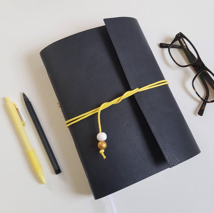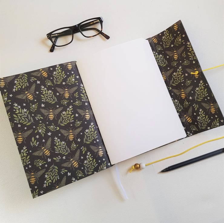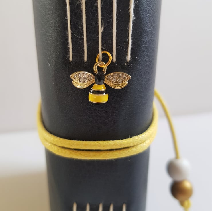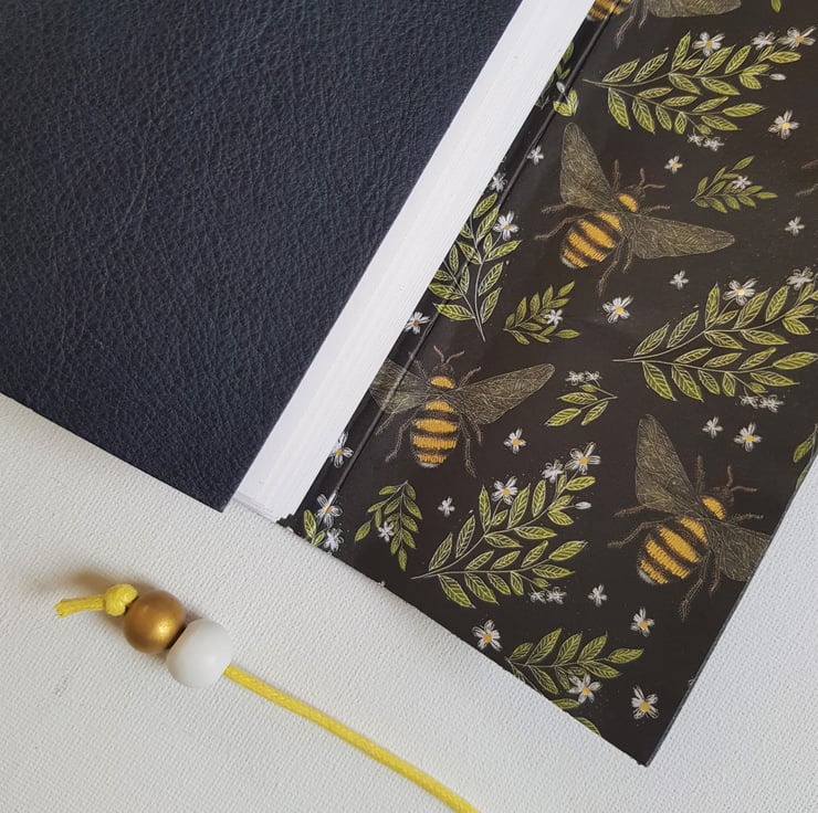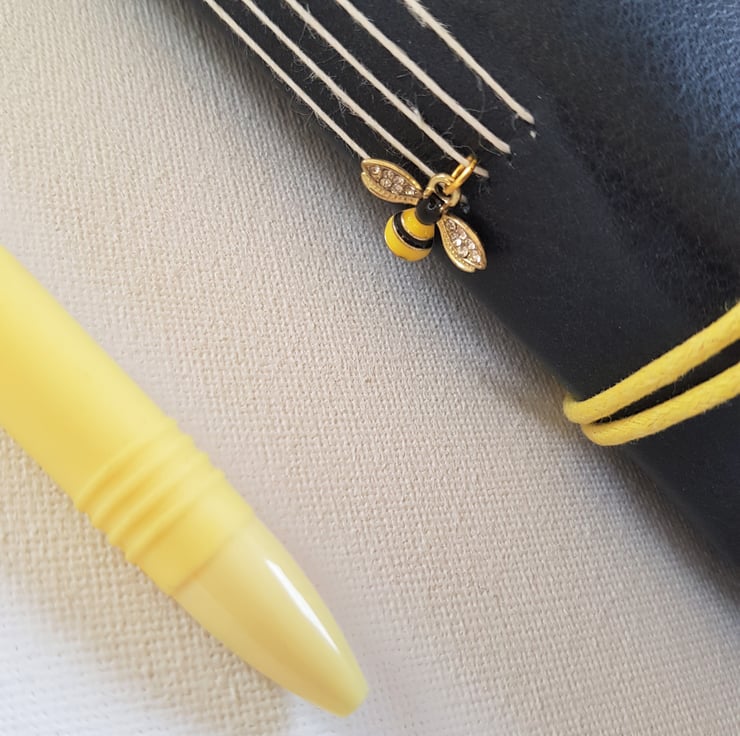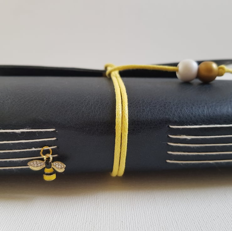 Hand Bound in Black Leather and closed with a yellow cotton cord and finished with a Wooden Bead. There is also a very cute enamelled Bee Charm on the spine of the Journal.