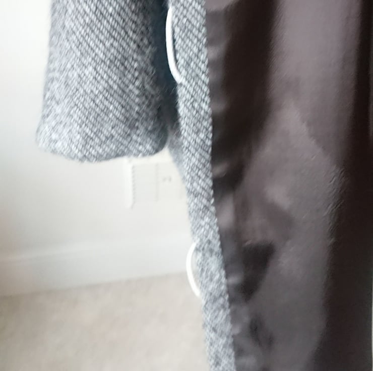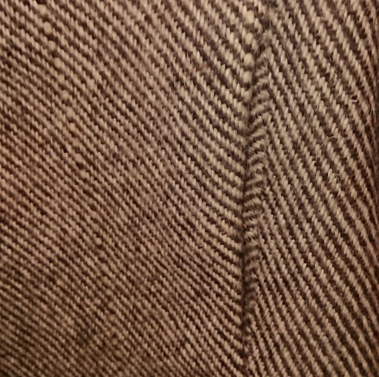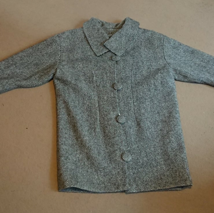 The coat is hand sewn from 100% wool (approximately 500 gsm) from wool grown in Kent from the indigenous Romney sheep, it is lined with dark brown 100% Viscose from an English supplier (105 glm - grams per linear metre) it has an asymmetric collar, a concealed pocket in each side seam (4th photo), subtle shaping in what seems like a straight cut, really large hand covered buttons (38 mm metal buttons when covered are about 40 mm diameter) which do up with handmade cord loops.