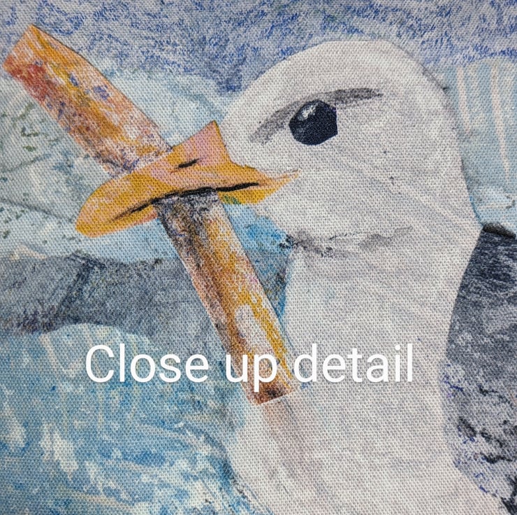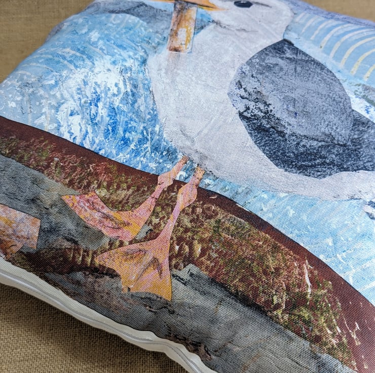 100% cotton cushion printed with my original collage of a seagull with his lunch. The reverse of the cushion is plain white cotton and it is stuffed with a fibre insert.