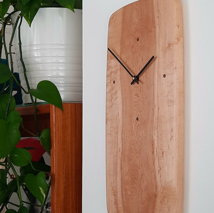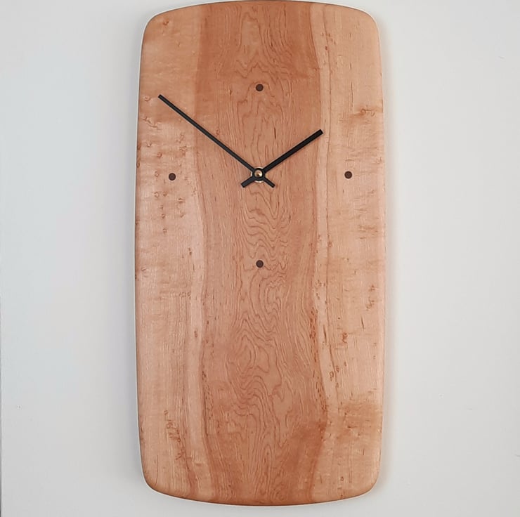 The Glas Wall Clock Medium is handmade from a solid piece of Birdseye Maple with complementary Walnut dots, marking 12, 3, 6 & 9 o'clock.
