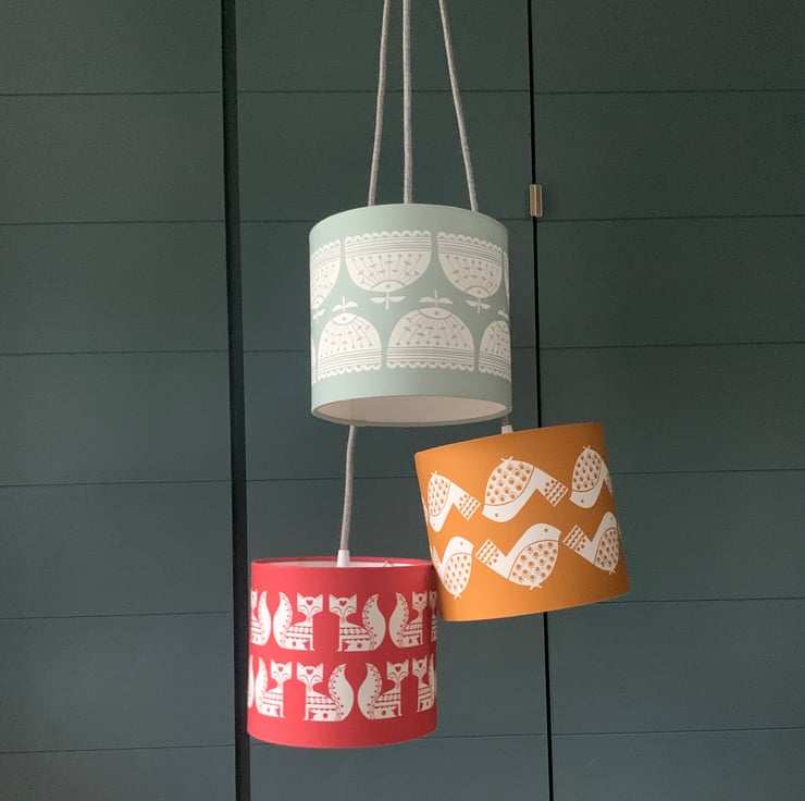 This vibrant Vintage Fox Lampshade, handcrafted in a bold red with vintage white foxes, features a bold 2-tiered offset repeat pattern, making it a vibrant colour pop for your home.