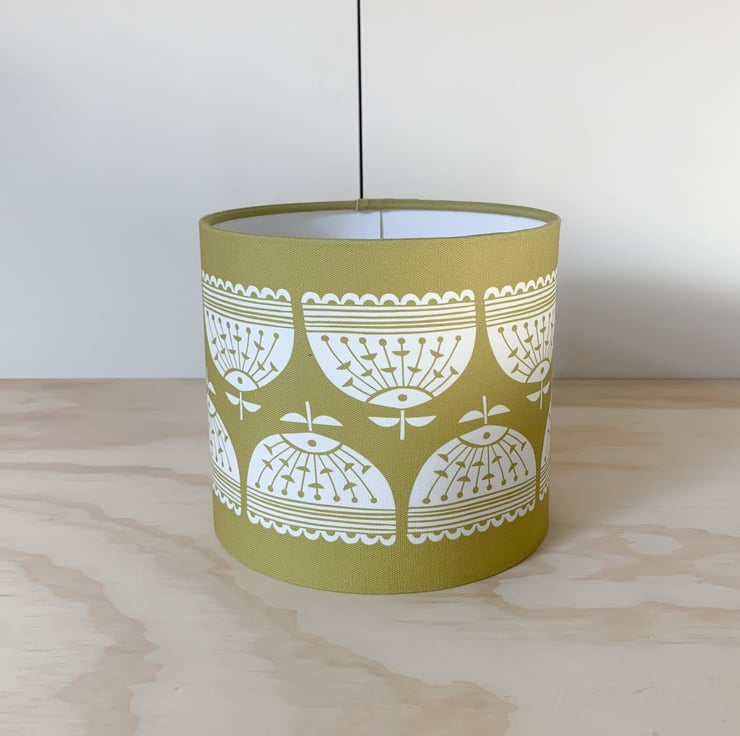 This lampshade is handmade in olive yellow and vintage white flower design in an offset repeat pattern, making a vibrant & bold color statement.