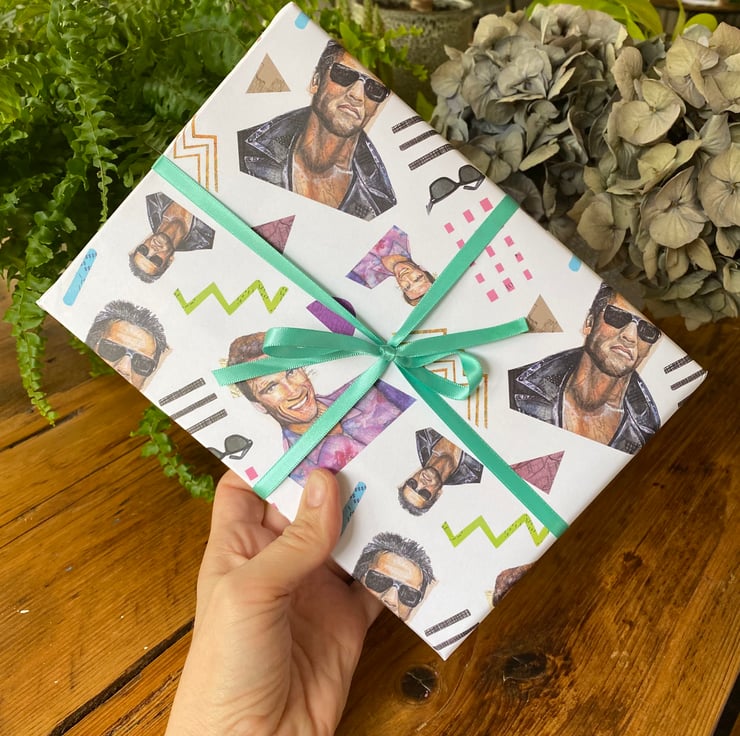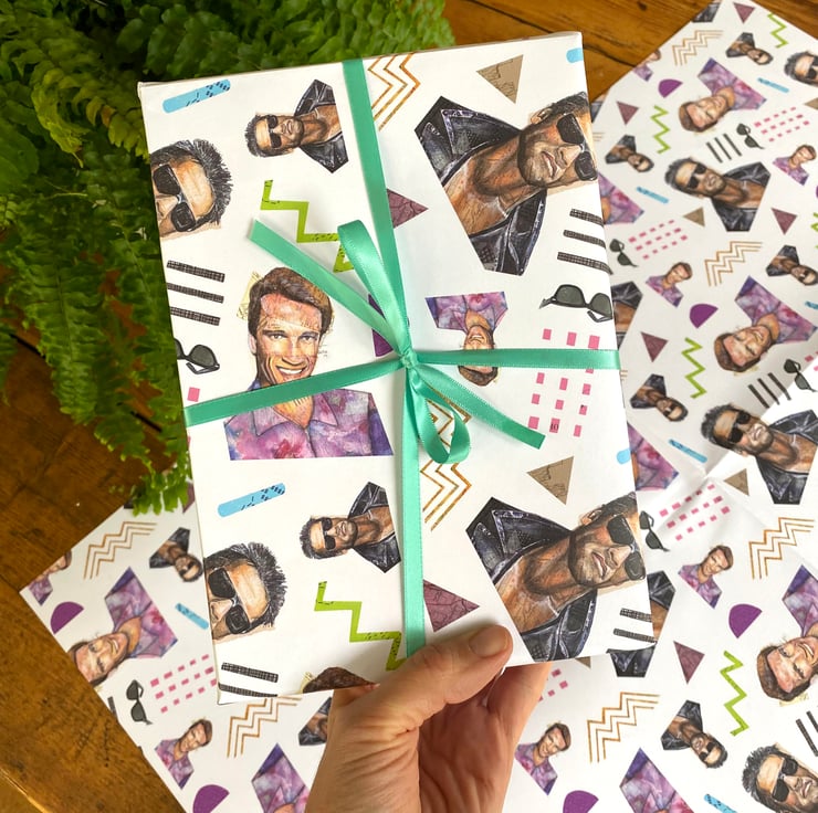 Fun gift wrap celebrating 1980's Arnold Schwarzenegger.
