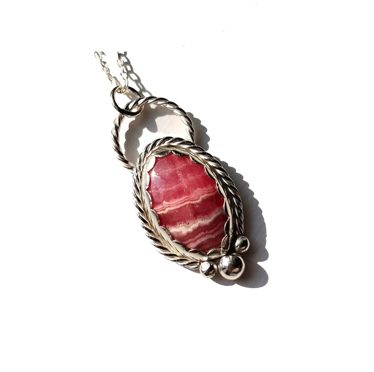 Handmade Rhodochrosite Silver Pendant on Necklace