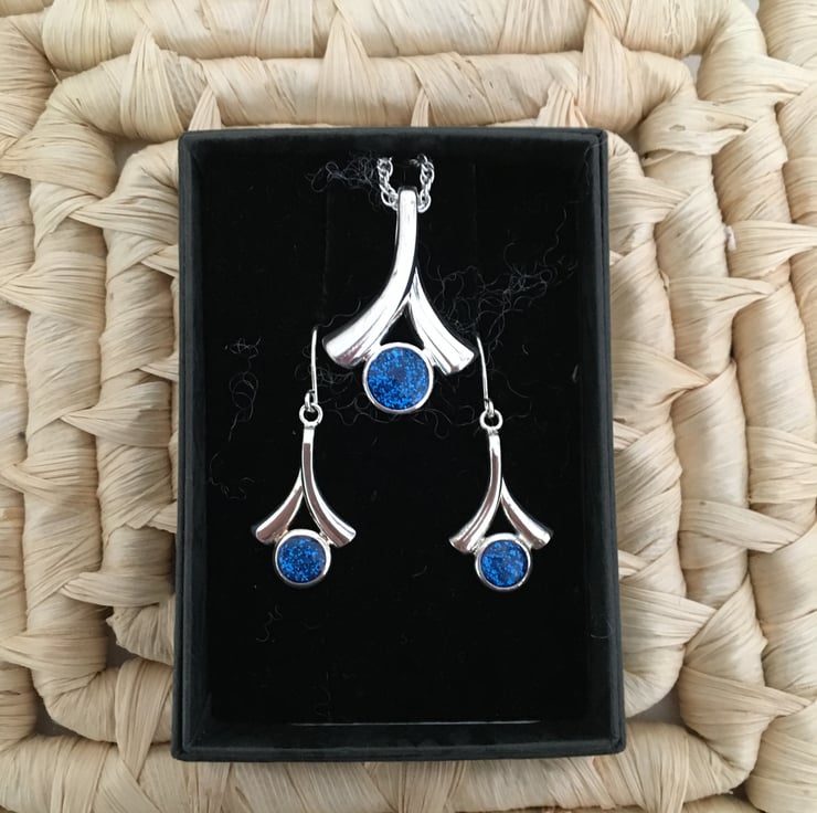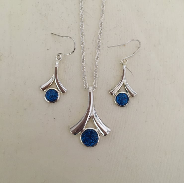The handmade centrepieces are created using a blue base mixed with a very fine glitter and then coated with a 2 part resin, giving a hint of a glint in the colour.