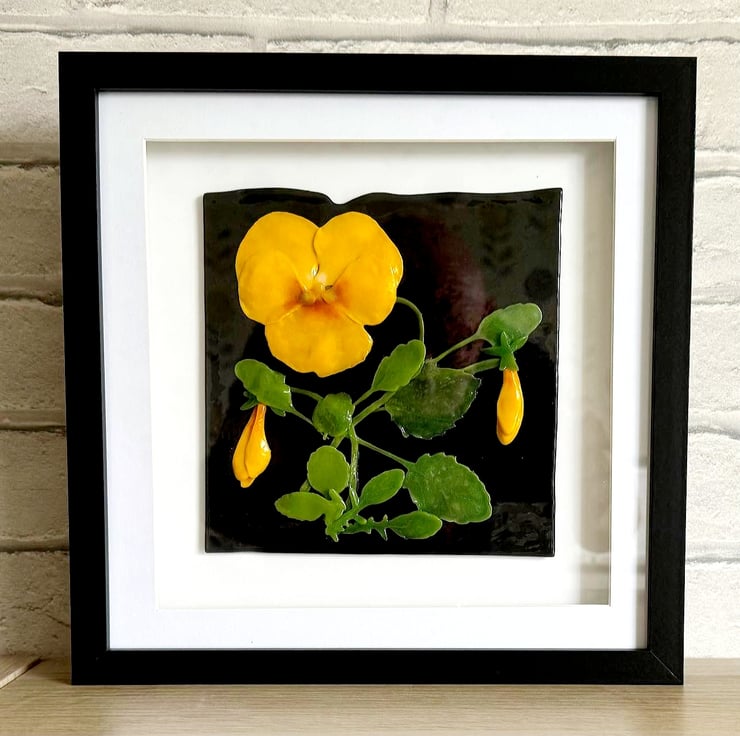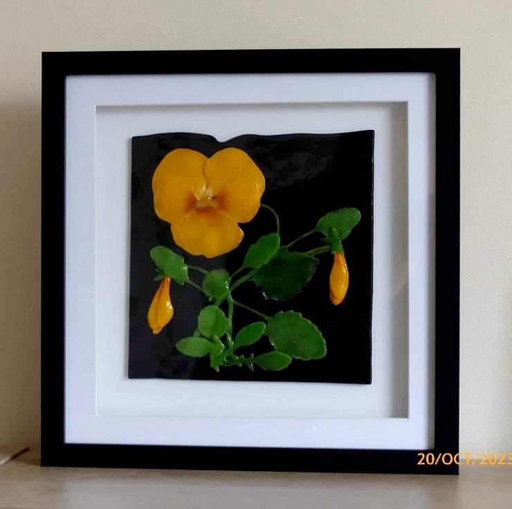 Created using coloured glass powders which are sifted through hand-cut stencils of individual petals and leaves. Several shades of powder are built up in layers to achieve a realistic colour and then kiln-fused as separate elements to bind the powders together. The resulting fragile glass 'wafers' are then layered into flower heads and fused again, and finally the picture is built onto a base panel of black glass and the third firing takes place, resulting in a delicate and realistic 3D image. I have retained the 'rolled edge' on the base glass in this instance. This is a natural feature of the production process of handmade glass, and is often discarded, however, I think it often adds to the interest of a piece.
