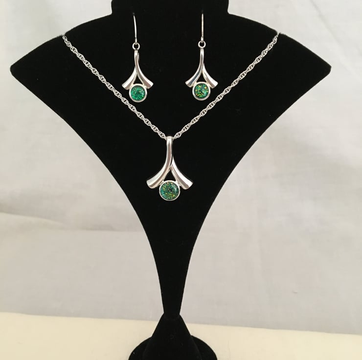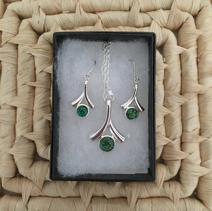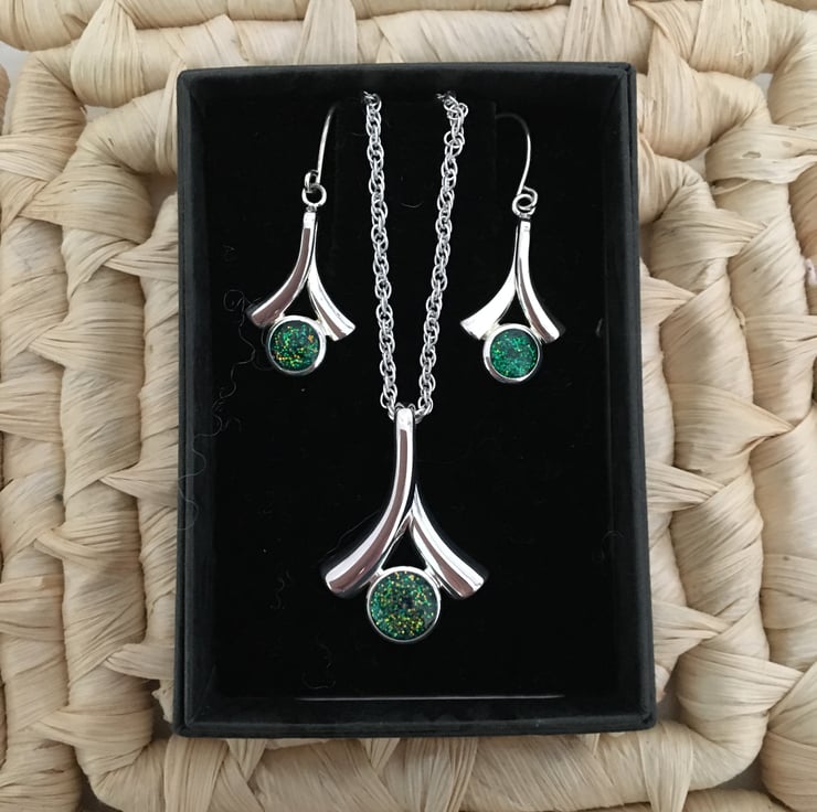 The handmade centrepieces are created using a green base mixed with a very fine green and gold glitter and then coated with a 2 part resin, giving a hint of a glint in the colour.