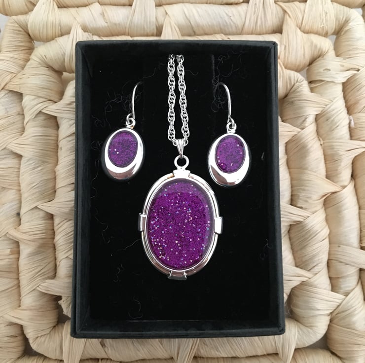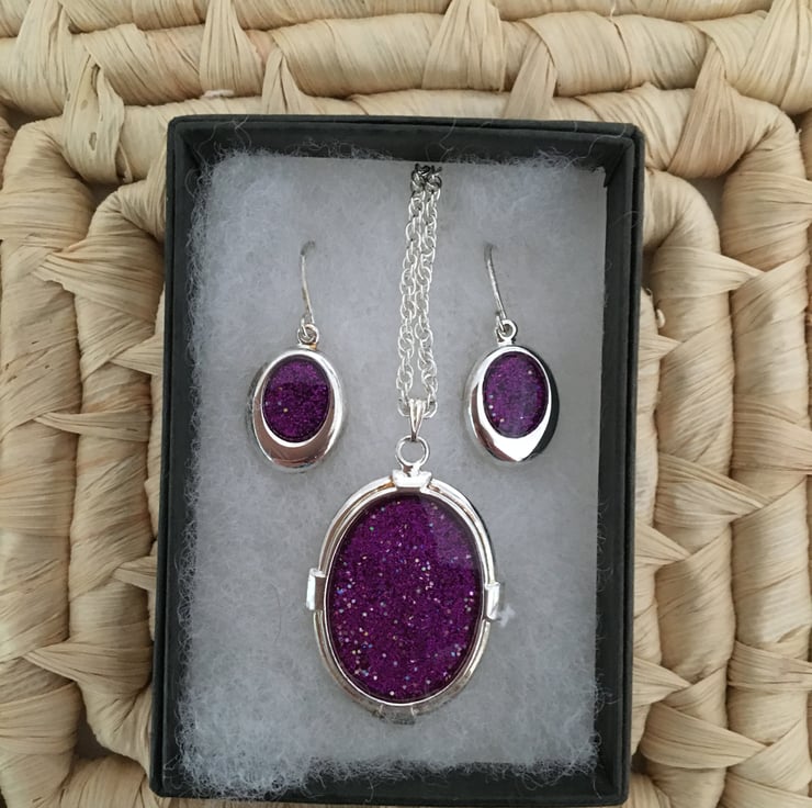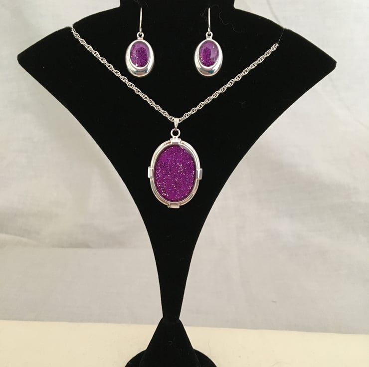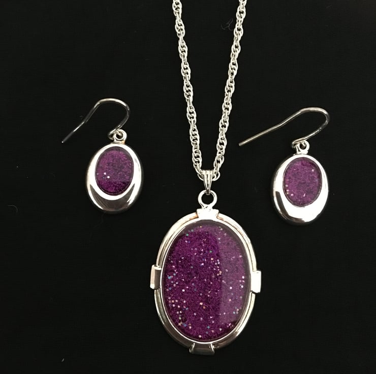 Handcrafted oval necklace and earring set in a high quality silver plated setting