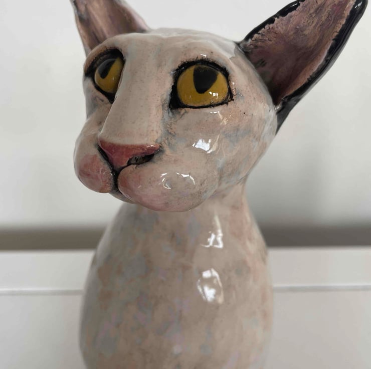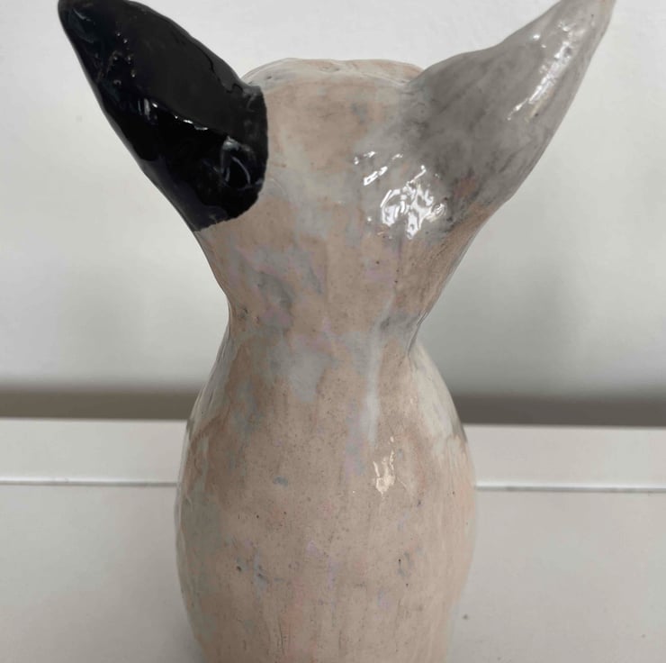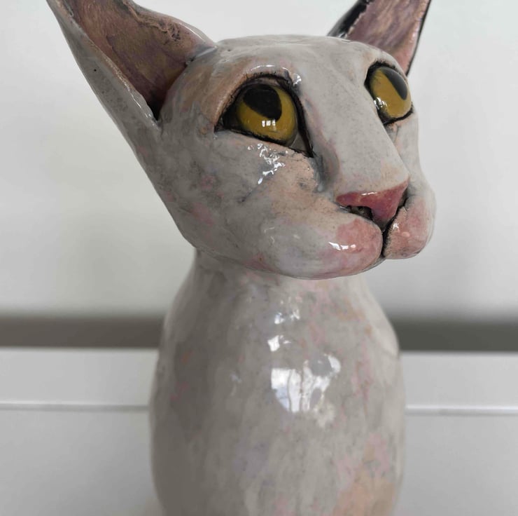 I like making cats and dogs. This one is inspired by the hairless cats you get. There is something I love about the colour and texture of clay with a wash of glaze then sponged back.