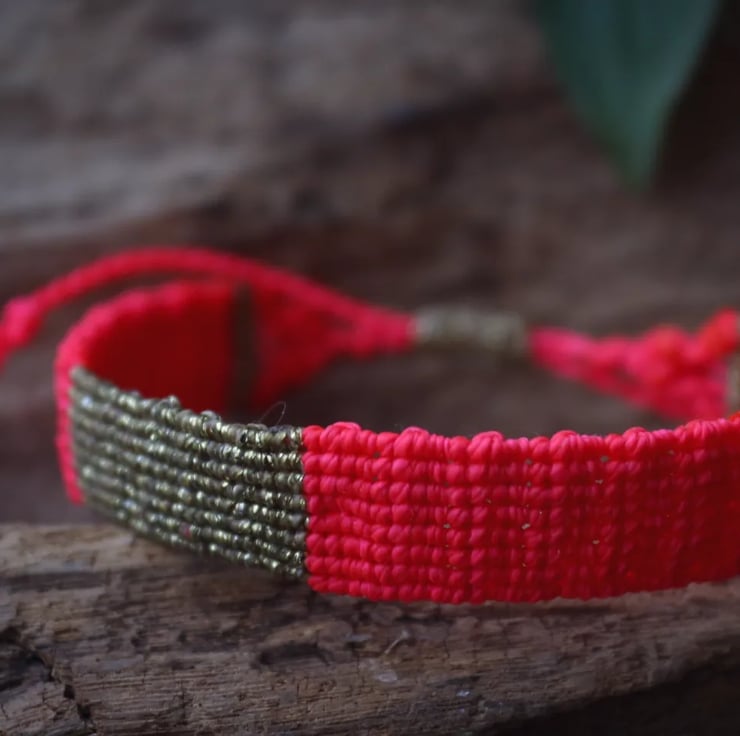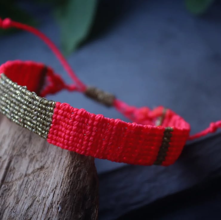 Add a vibrant and stylish touch to your wrist with our Neon Pink and Gold Macrame Bracelet. This adjustable accessory effortlessly brings a fun and chic vibe to your look.