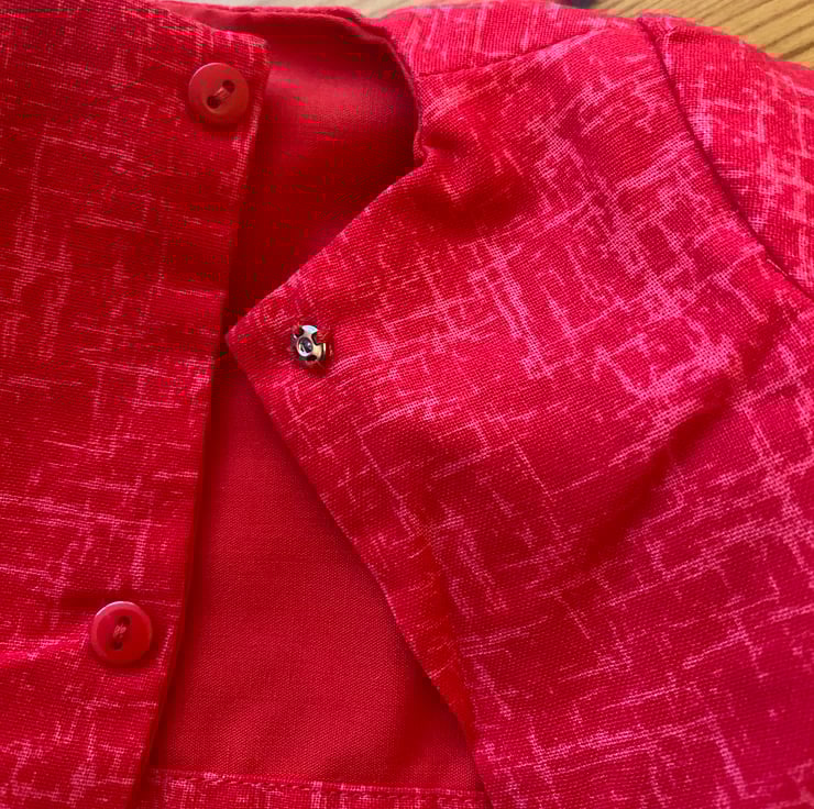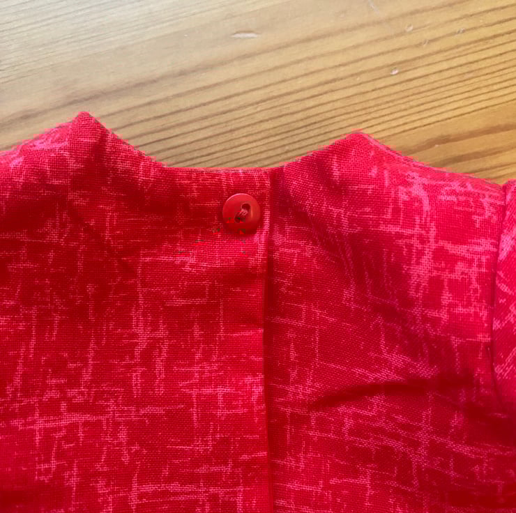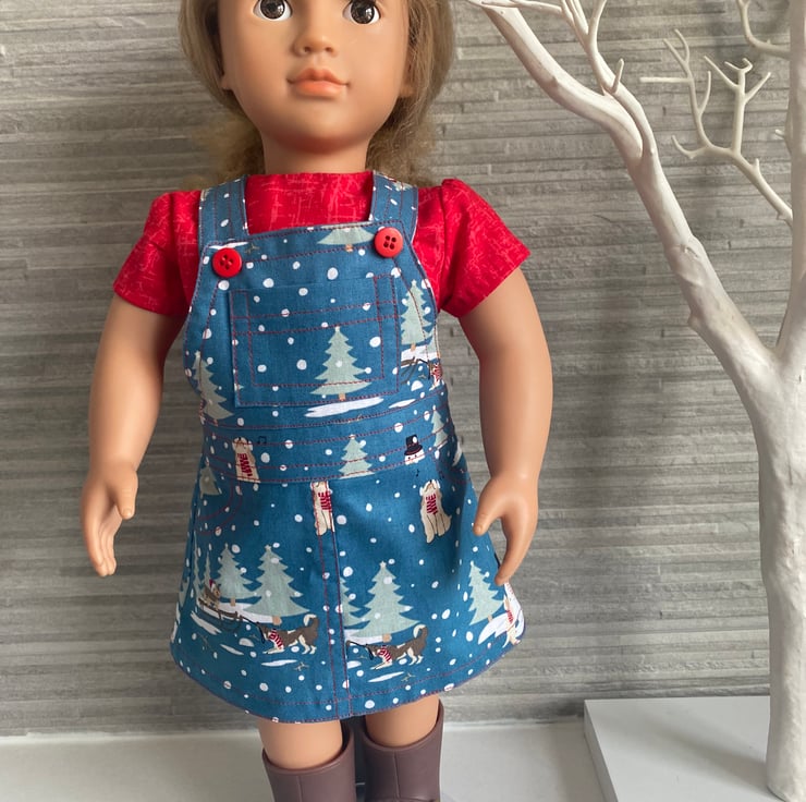This pinafore dress is a petrol blue colour with a Christmas theme, the contrast stitching is red to match the short sleeve top. The top and pinafore have dolly size buttons and snap fasteners to close them.