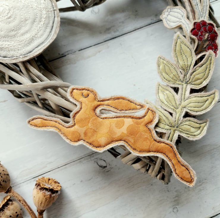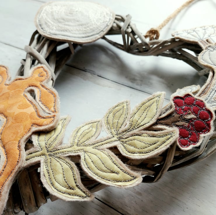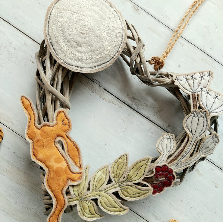 This rustic wicker heart shaped wreath is decorated with freemotion sewn applique fabrics on to felt.