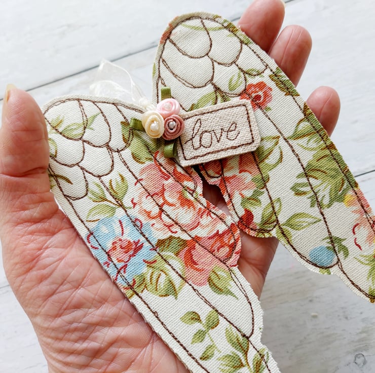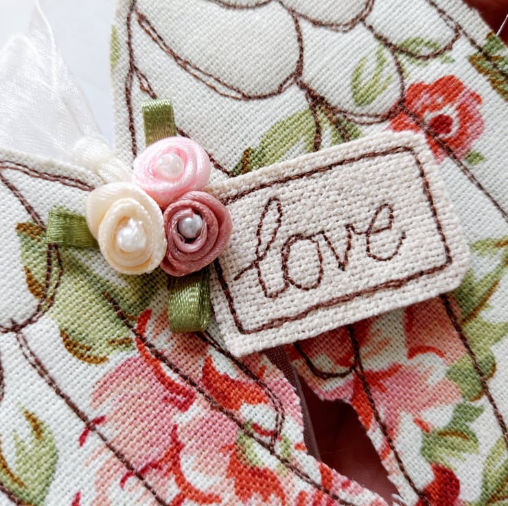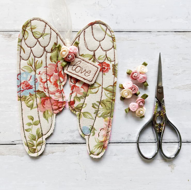 These hanging angel wings are freemotion sewn furnishing weight fabric appliqued onto felt. Decorated with ribbon rose buds and a message of love. Finished with a organza ribbon to hang it with.