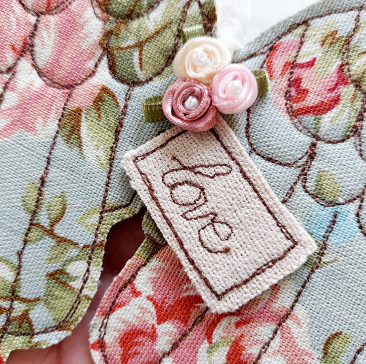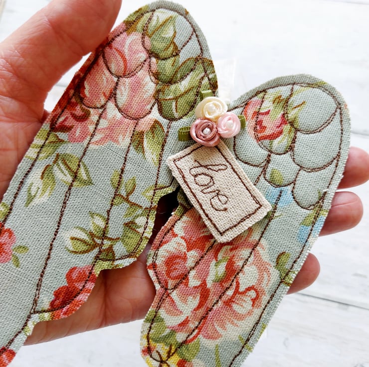 These hanging angel wings are freemotion sewn furnishing weight fabric appliqued onto felt. Decorated with ribbon rose buds and a message of love. Finished with a organza ribbon to hang it with.