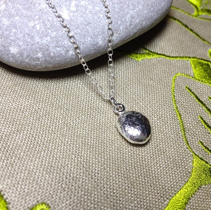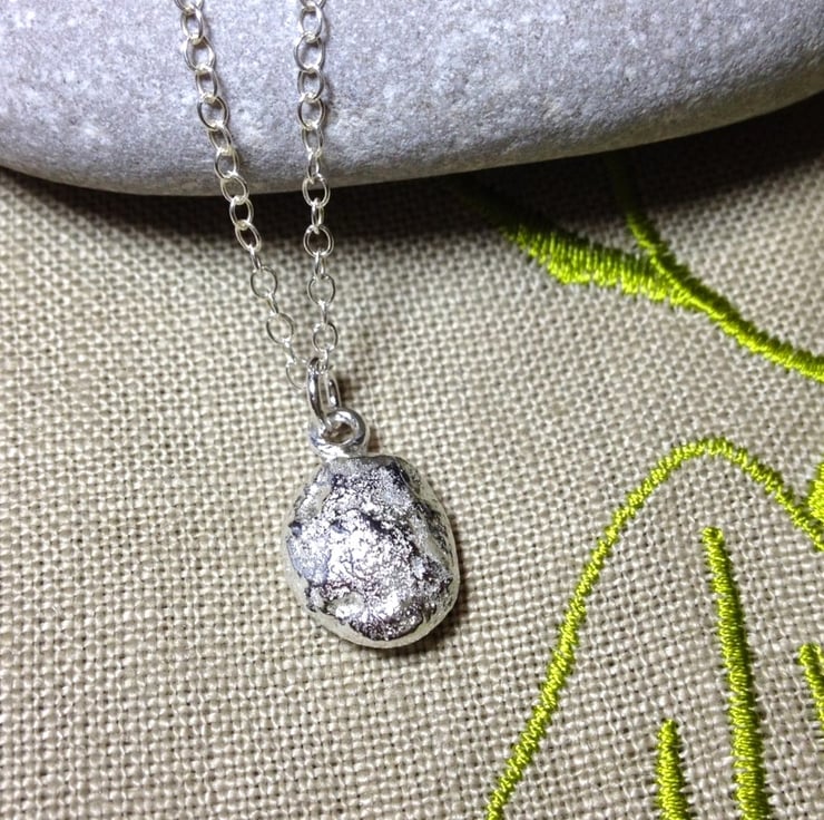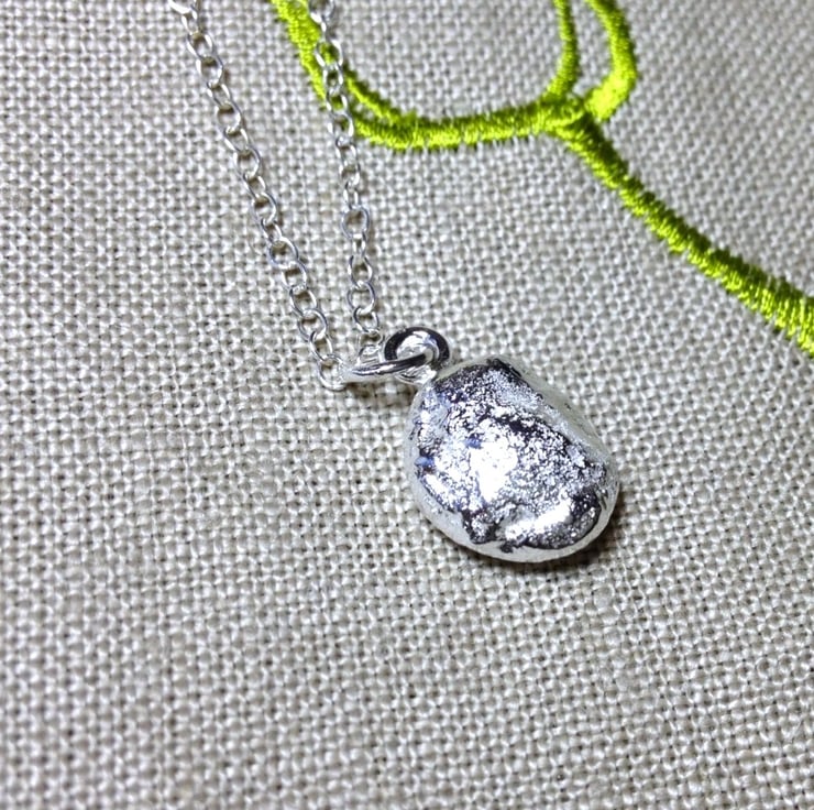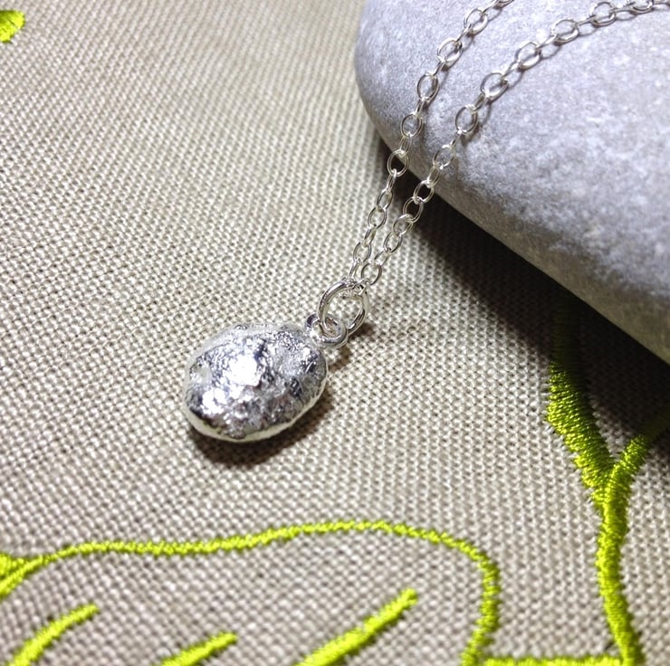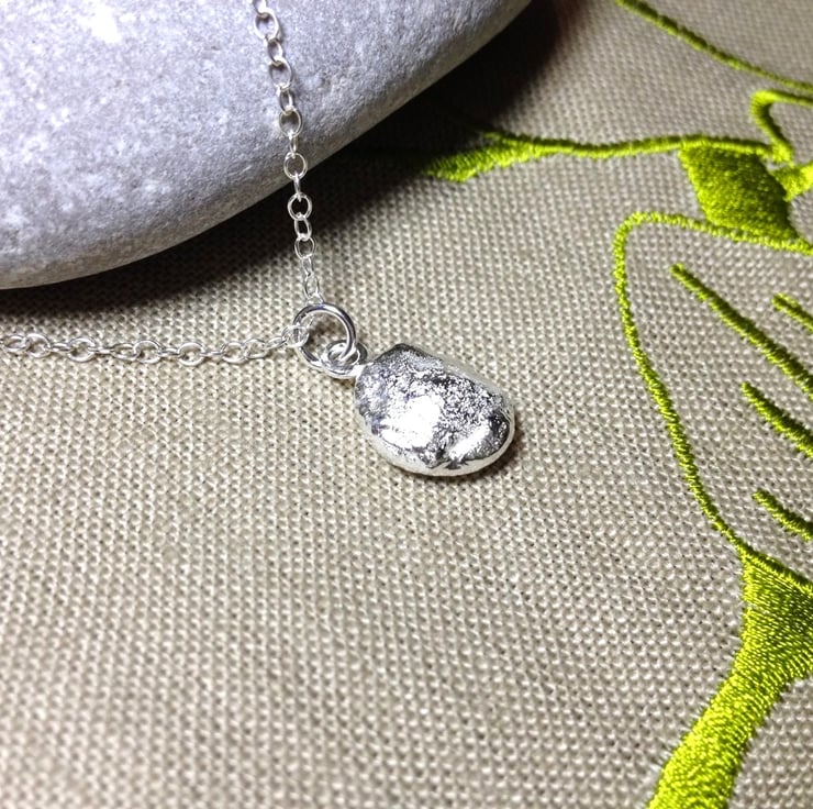 Lovely simply styled solid silver nugget pendant molten from recycled silver and hung on a 16" silver trace chain.