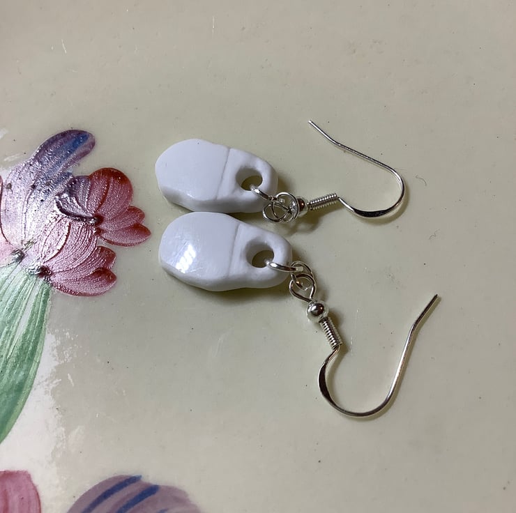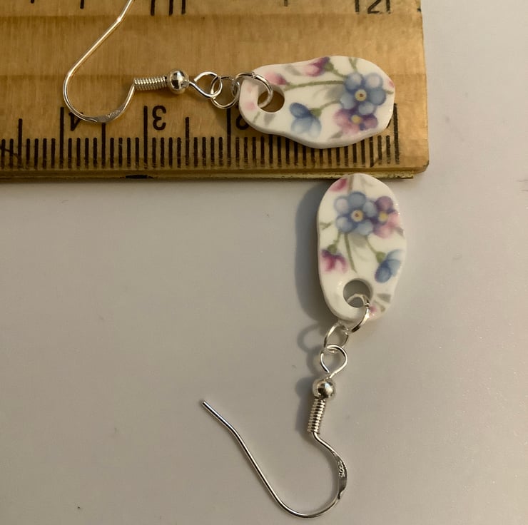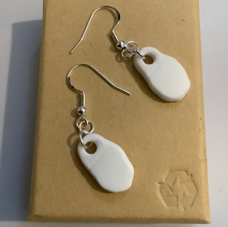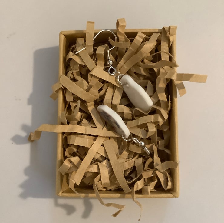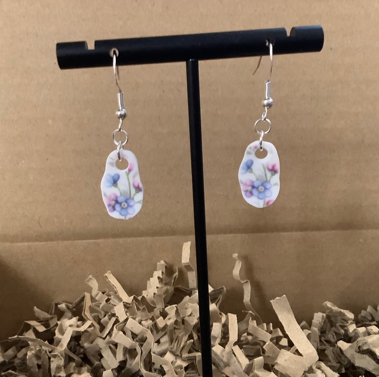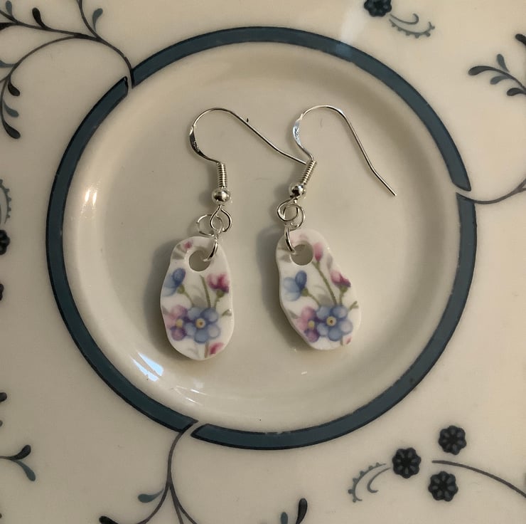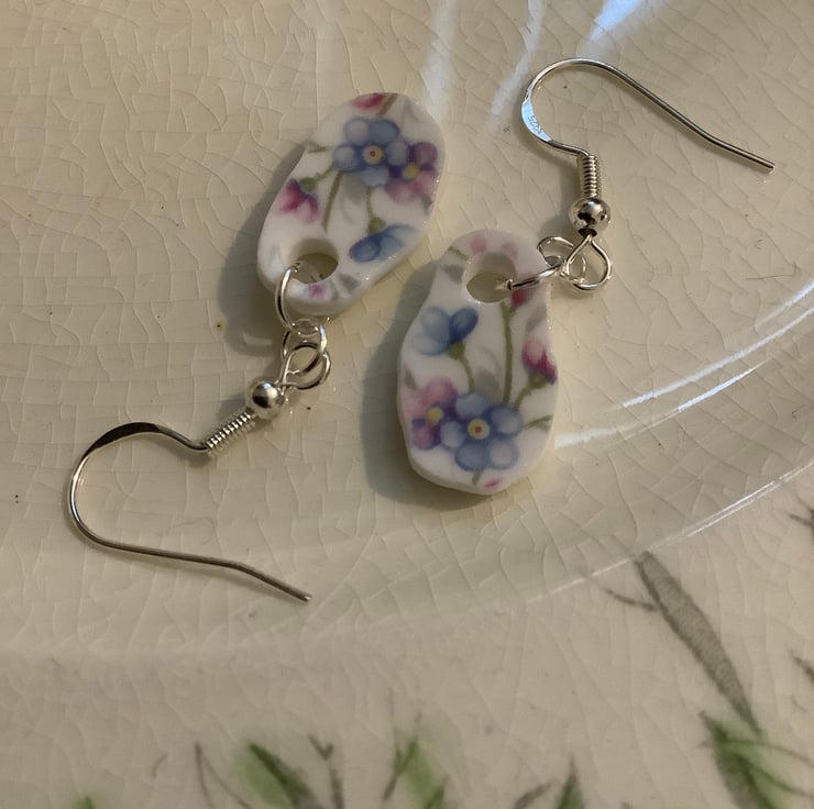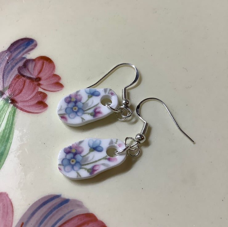 These earring are made from the rim of one of the saucers. I was surprised at how these two pieces were alike, all I have done is clipped off the sharp edges and sanded. Front and back glaze in tact, I have sanded around the hole to remove any loose glaze. Sealed with eco friendly, non toxic matt sealant.