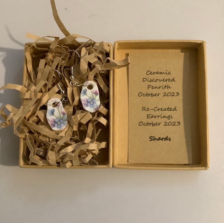 Hand crafted Jewellery and framed artworks using pre loved and discarded ceramics. Ceramic material will show signs of wear and damage. Entire process is a creative experience from discovery to final picture, nothing planned or preconceived. All materials personally collected from river banks, charity shops, roadside, woods, recycle centres, beaches, wherever dropped, dumped or donated ceramics are found, cleaned and shaped into new stories. Each piece comes with a short bio of where the ceramic came from, date found and re-created. Some shards collected are used as found, others are cut randomly which shape the final work. Every piece is individual, nothing replicated, however, due to repetitive patterns in ceramics there will be some similarity but only through the ceramic material not in the final piece.