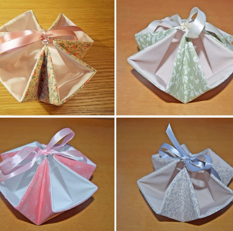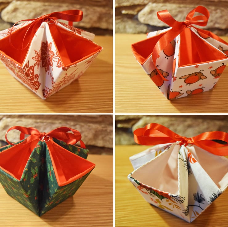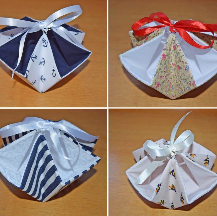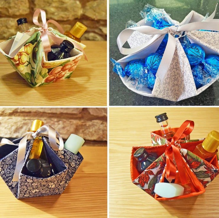 Handcrafted gift box baskets. Made with high quality polyester cotton fabric and colour coordinating double sided satin ribbon.