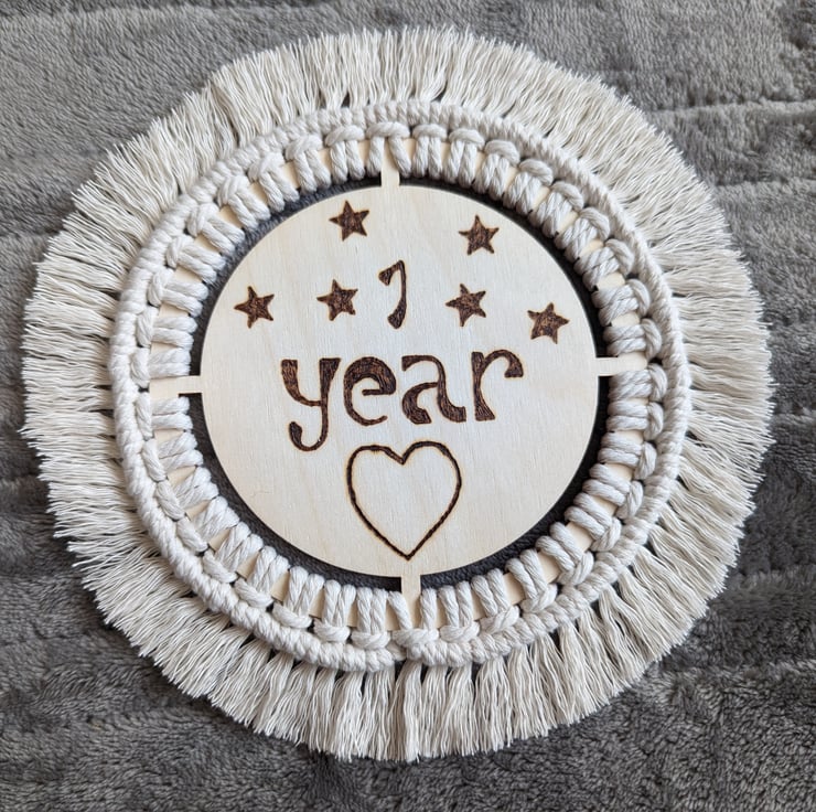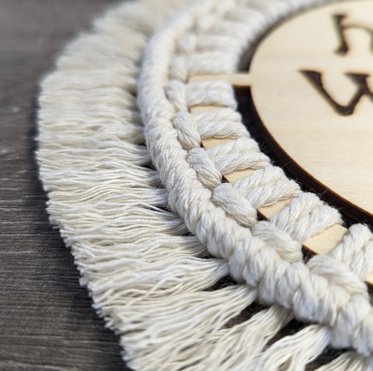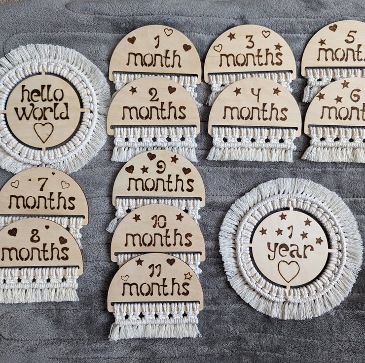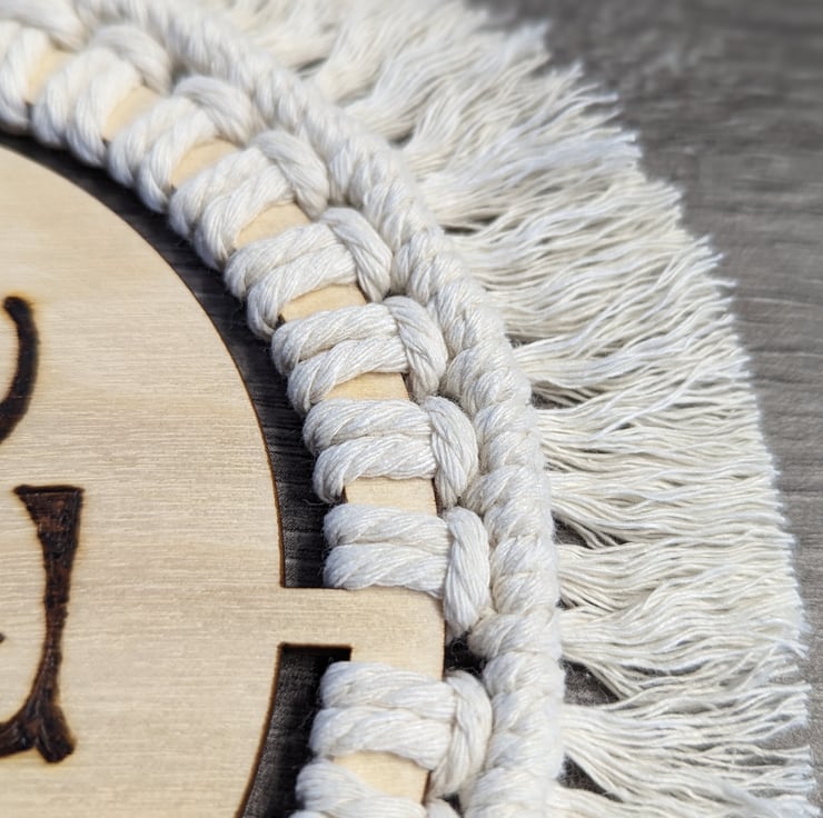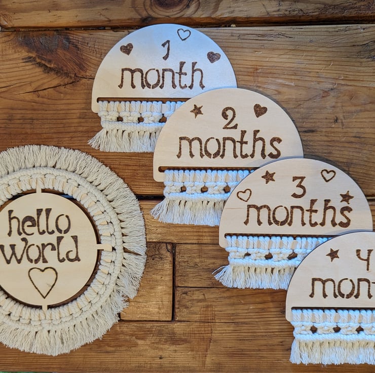 Celebrate your baby's milestones with these cute wooden and macrame milestones. Each one is crafted from beech plywood and has been hand written using a pyrography pen. A macrame fringing completes each one giving them a soft yet rustic feel.