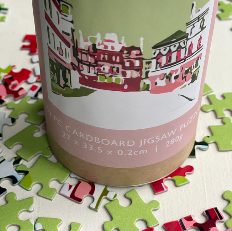 This lovely puzzle is made from 2 mm thick sturdy cardboard, it is printed onto the cardboard using dye sublimation, this ensures the inks are fused deep into the fibres of the material and create a lasting print. The puzzle is supplied in a cardboard tube made from recycled paper with gold metal end caps. The labels are printed upon recycled, 100% post consumer waste, FSC certified paper which is chlorine-free. The jigsaw pieces are held within a clear bio-degradable and compostable bag. My goal has been to create an eco-conscious, sustainable gift.