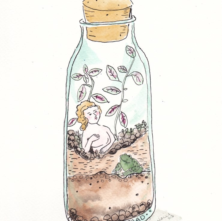 This is artwork is part of a series of artworks for Inktober 2023. Each day throughout October there are word prompts. I have based all of my drawing in terrarium as a challenge to myself to keep them all consistent.