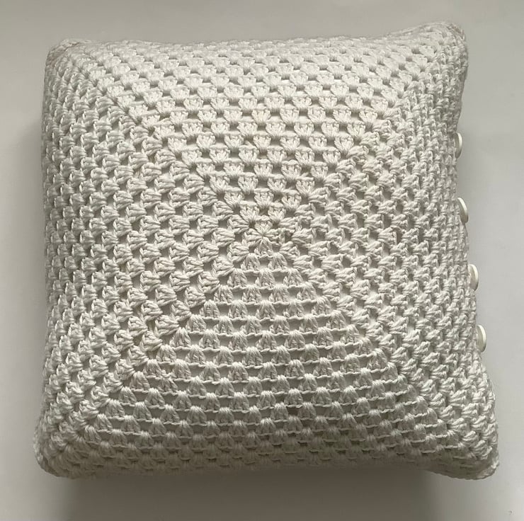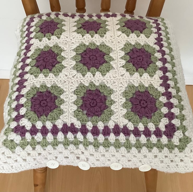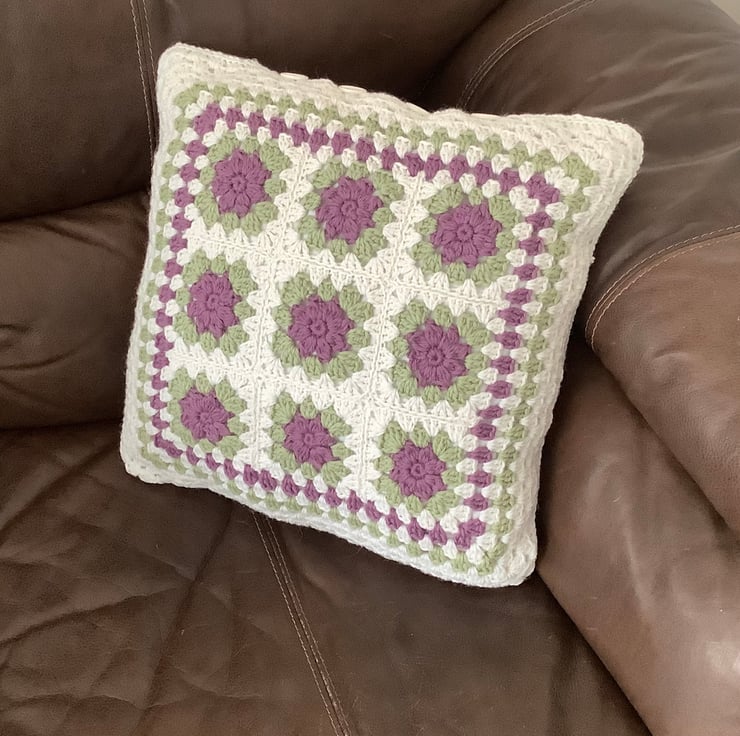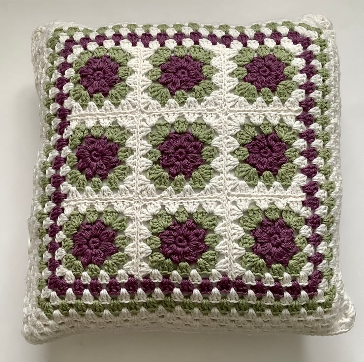 I have designed and crocheted this large cushion cover in a Provencal floral colour scheme , using lovely soft Alpaca/ wool yarn . Double -sided . The 'front' being made up of 9 individual flower motifs .The back is crocheted in a traditional 'granny square' pattern .( in white only ) Four large white buttons have been sewn to the top , which act as simple closures.