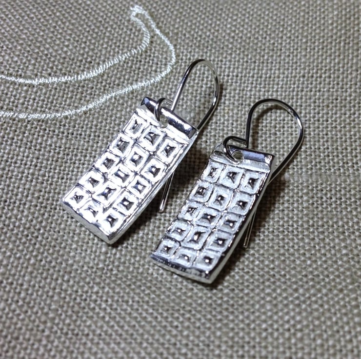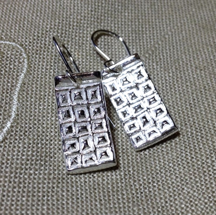 I call these my silver dot earrings. These earrings have been cast out of recycled silver and are heavily textured on the front surface with squares and dots with the back left plain. They are slightly curved and are hung on silver ear wires.