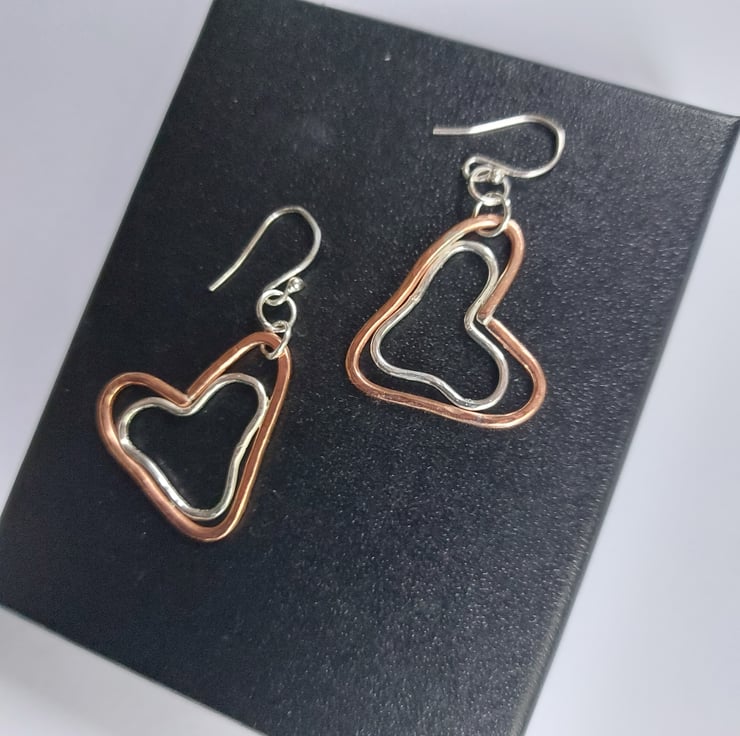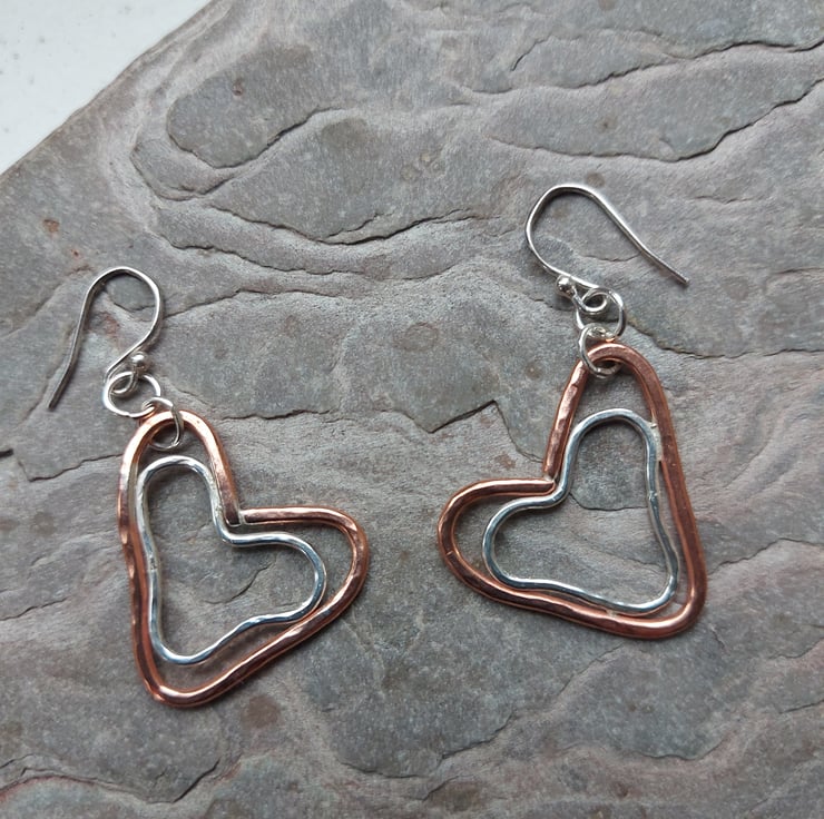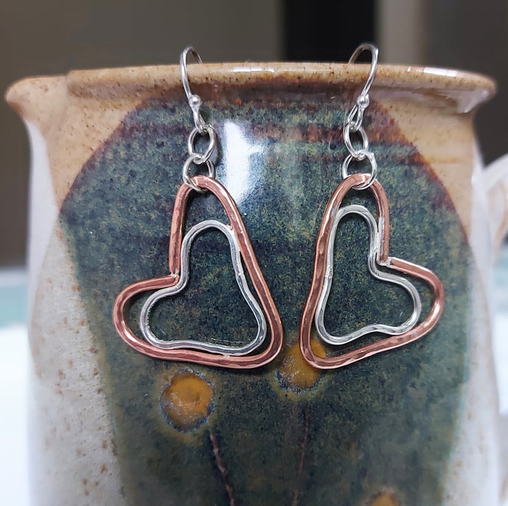 These romantic dangle earrings feature two hearts, cosily nestled one within the other. They represent love and security between partners, friends and family members - ideal as an anniversary or Valentine's gift or to celebrate a new arrival. The outer heart is shaped from 2mm copper wire and the inner one from 1.5mm sterling silver. The two are soldered together and jump rings have been added at the top for attachment to the handmade silver ear hooks. Each earring is 3cm wide and 2.5cm tall. The total drop beneath the hook is 3.5cm and the mass of each earring is 2.5g.