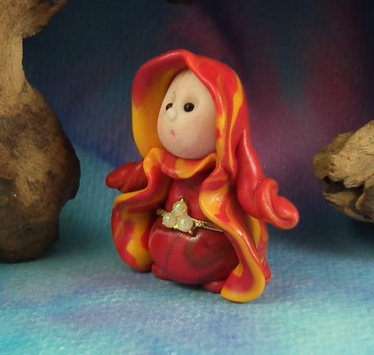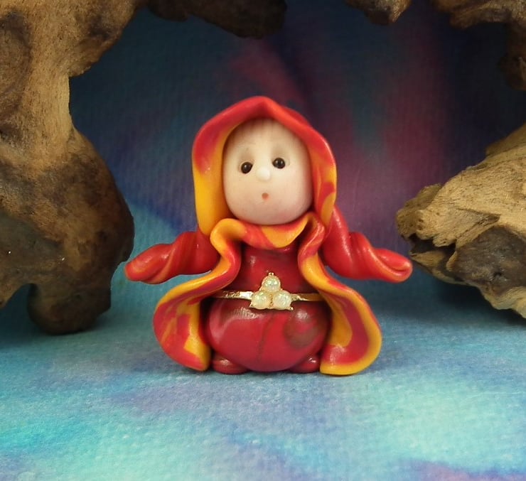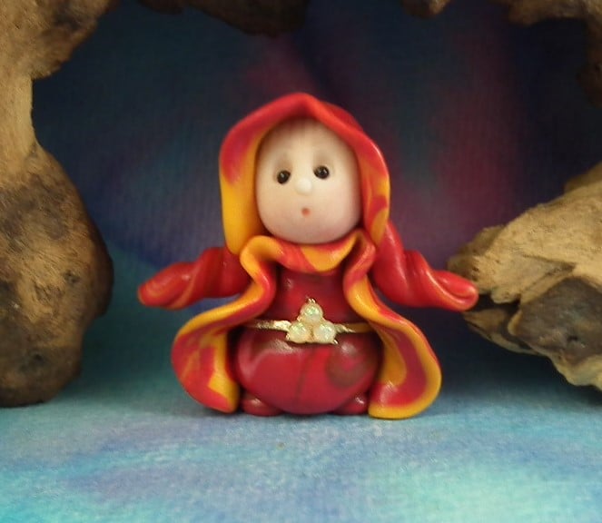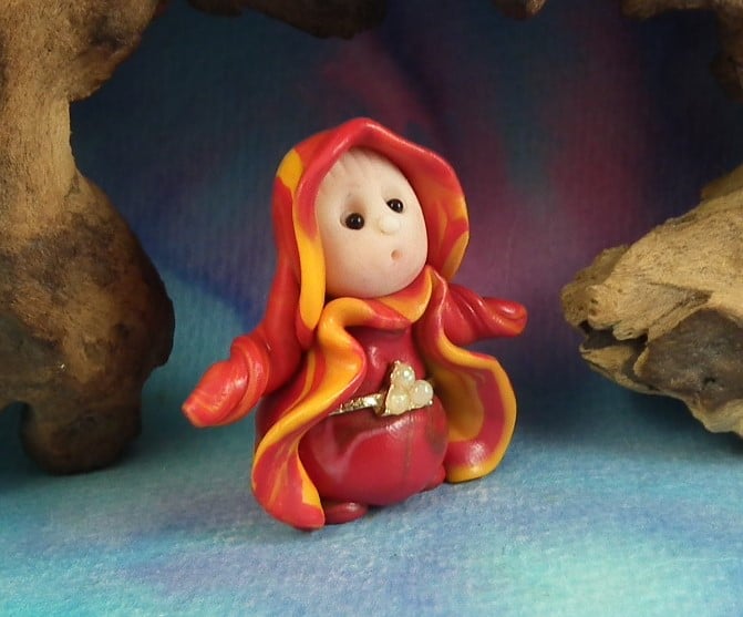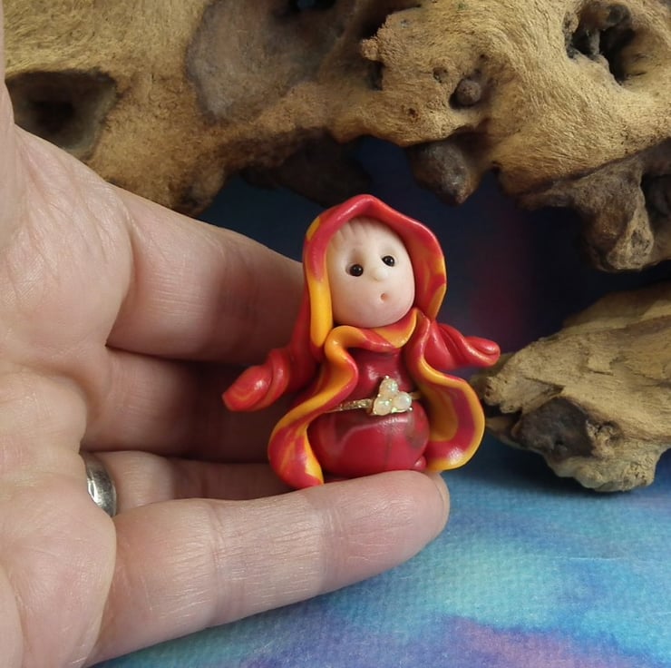 This is a 'one of a kind' creation having been entirely handmade without the use of moulds here at my studio on the Sussex Coast. Modelled with artist blend polymers, blushed before sealing with lacquer, Ferno has sparkling black onyx eyes and flaming robes. Ferno the Elemental Gnome is just over one and a half inches tall.