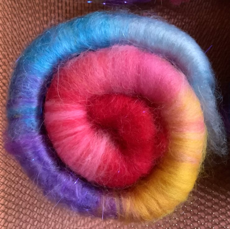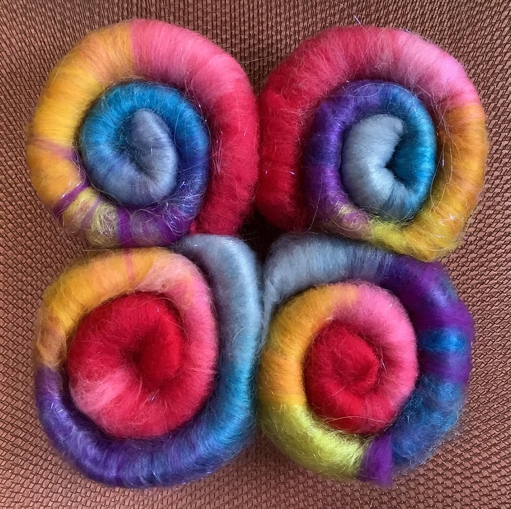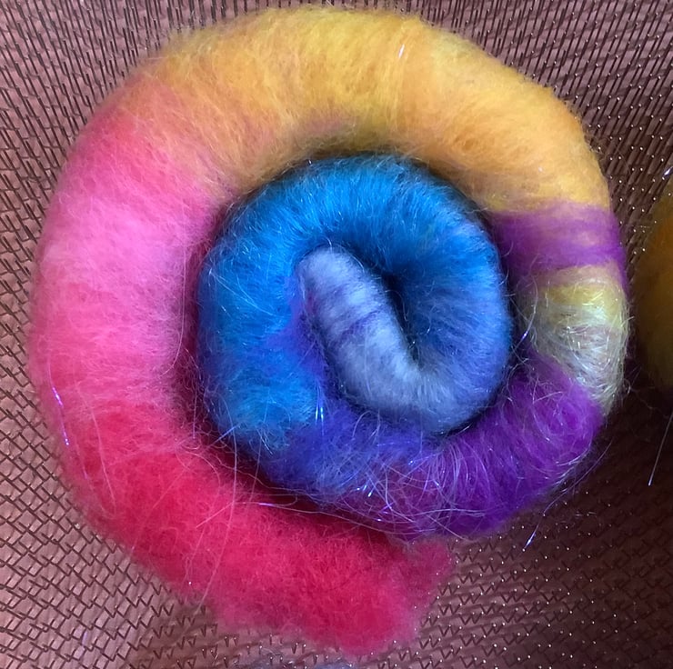 These rolags can be used for spinning or felting. They have been hand dyed and blended on a blending board. The blend contains merino and angora (mohair) plus a little added sparkle.