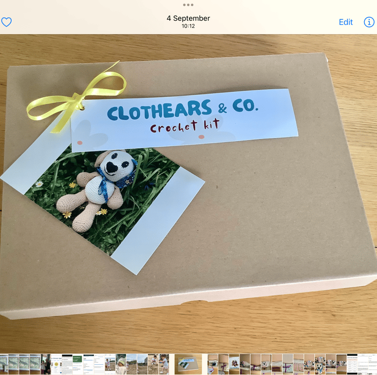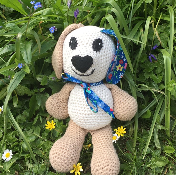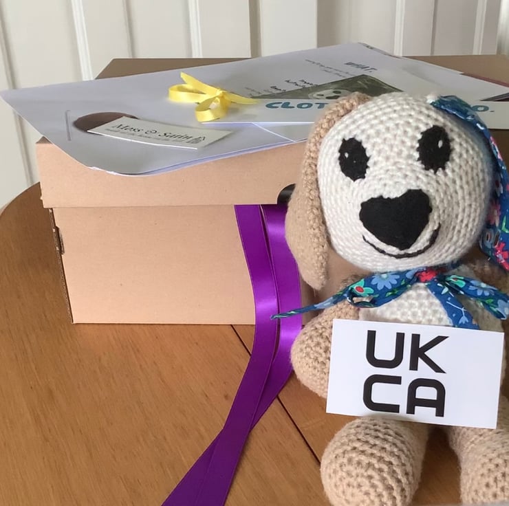 This is a Crochet kit made by me to make a Clothears puppy. Clothears is a crocheted dog with one fabric ear, hence Clothears. The Kit contains Yarn,Felt,Thread, Stuffing, Fabric, Crochet Hook and Instructions. All the materials used to make Clothears in this kit have passed EN71 certificate. They have undergone chemical, flammability and physical tests. As the physical tests were carried out on the Clothears that I made, I cannot guarantee the physical test on Clothears made by a third party. This kit is not intended to be a toy, but the finished Clothears can be used as a toy and so the tests were necessary. The yarn and fabric are 100% Cotton. Can be washed at 30 degrees. Some previous knowledge of crocheting and ability to sew is advisable.All the necessary equipment is stored in a box as seen. Ribbon not included.
