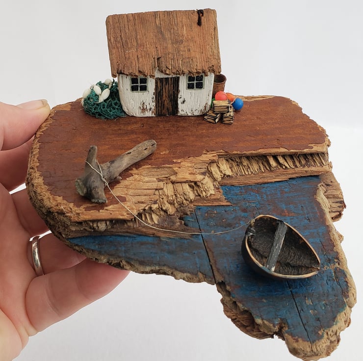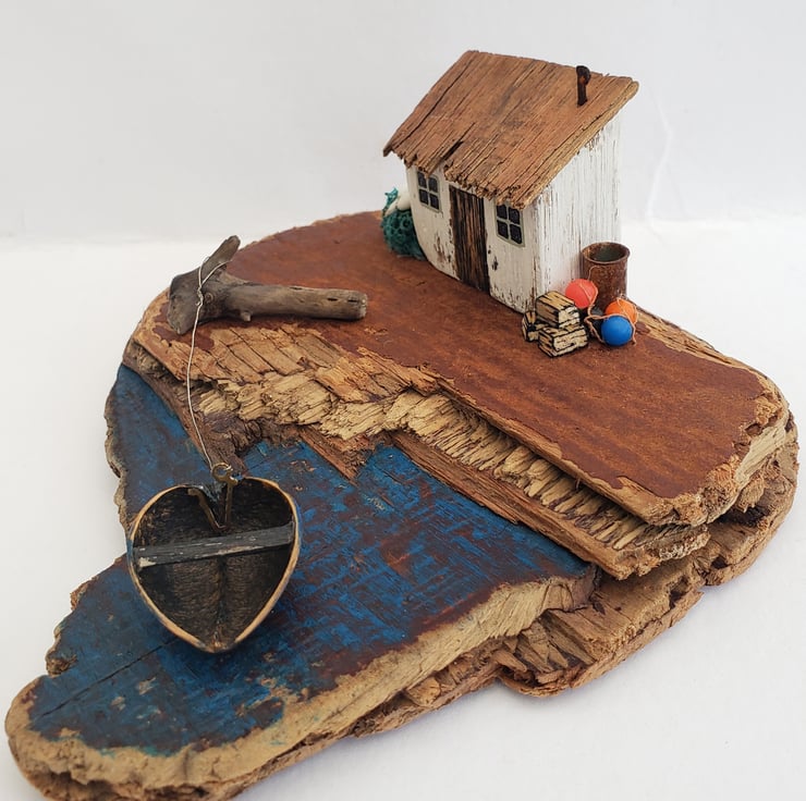 This little driftwood scene depicts a fishing bothy by the water with a boat secured to the log on the shore. Fishing nets, buoys, boxes and water butt surround the little building.