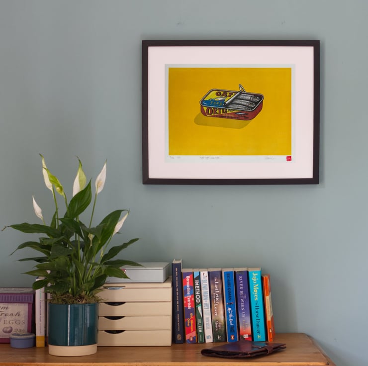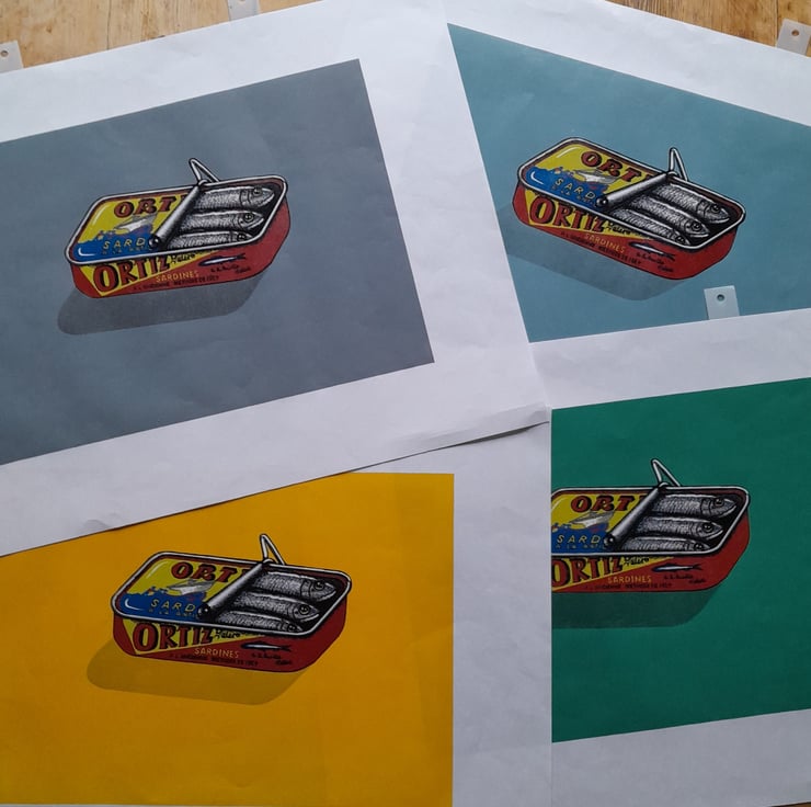 This is a multi-colour linoprint of a sardine tin. It's a limited edition of 15, in 4 colourways printed on Awagami Masa printmaking paper. I have Yellow, Blue, Green and a couple of Grey.