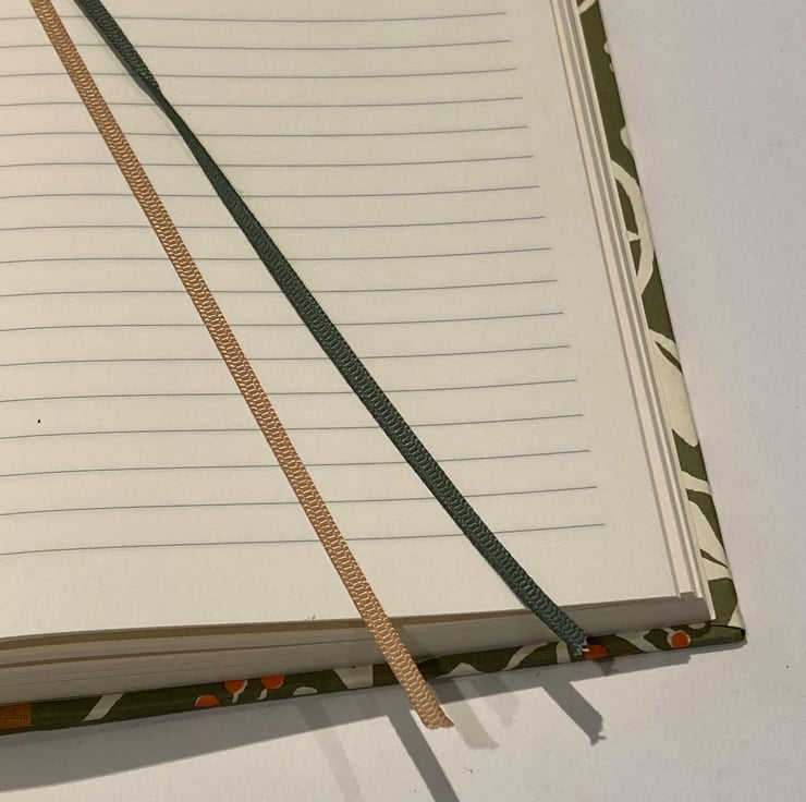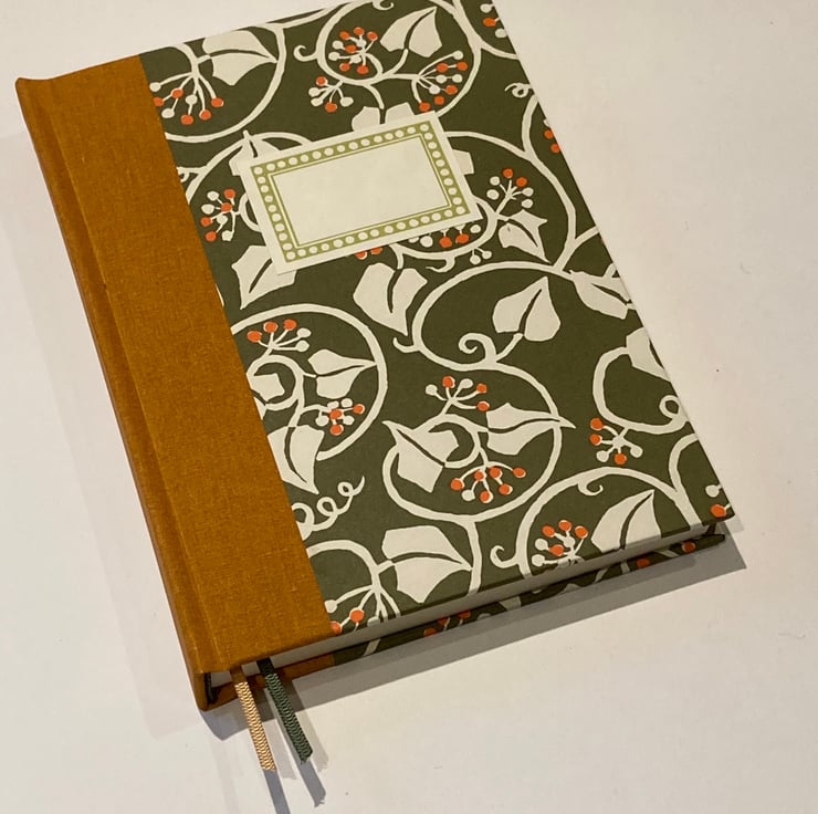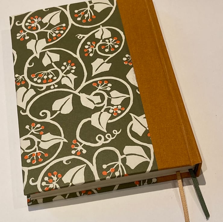 A5 lined journal, hand bound in autumn colours with quality amber coloured bookcloth on the spine and beautiful Ivy design paper from Cambridge Imprint for the covers. Finished with a smart label on the front and two grosgrain ribbon markers.