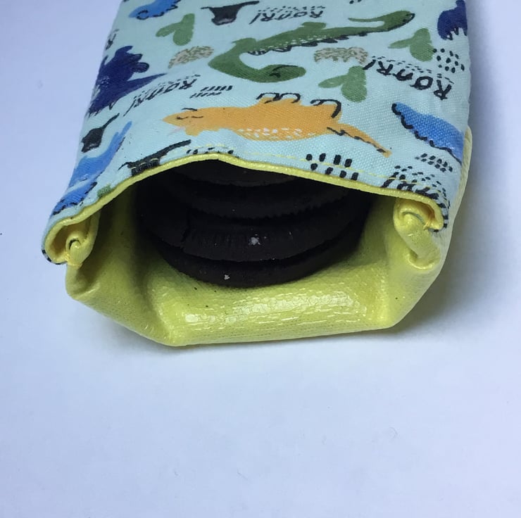 Our food bags are made from cotton dinosaur fabric, lined with yellow PUL - a food safe, waterproof fabric that keeps your lunch fresh. They are constructed similar to a pillowcase, with no Velcro or fastenings to trap crumbs. Bags can be wiped clean or even washed in the machine, meaning that not only do they reduce your use of single-use plastics but they are hygienic and simple to use. They’re also great for keeping things fresh in the fridge.