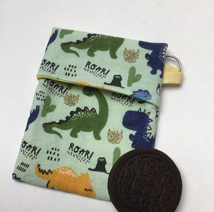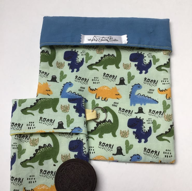 The sandwich bag measures approximately 16 x 19cm. The snack bag is 9 x 11cm and has a loop and ring sewn into the seam that can be used to clip it onto your buggy or bag.