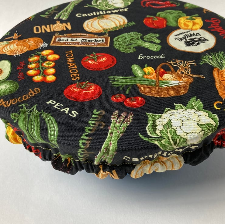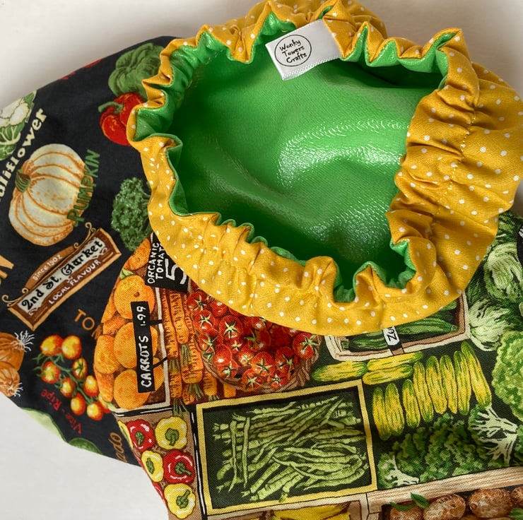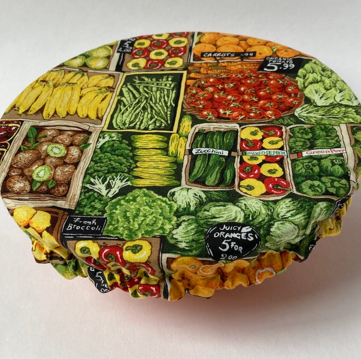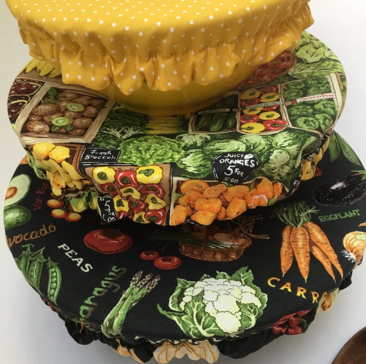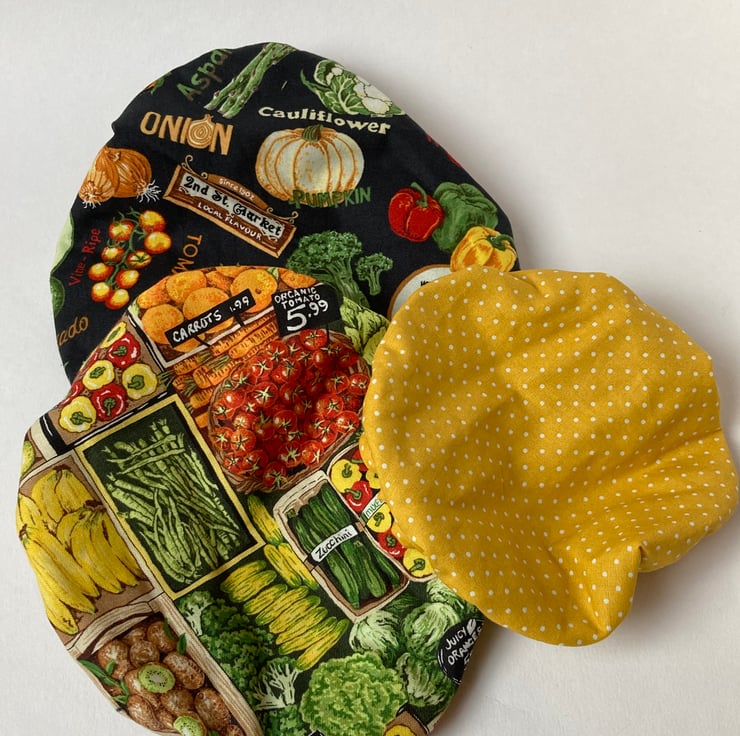 This set of 3 covers will fit bowls approximately 23cm, 19cm and 16cm (9", 7.5" and 6"). They are made from 3 co-ordinating fabrics featuring fruit and vegetables. They are lined with green PUL.