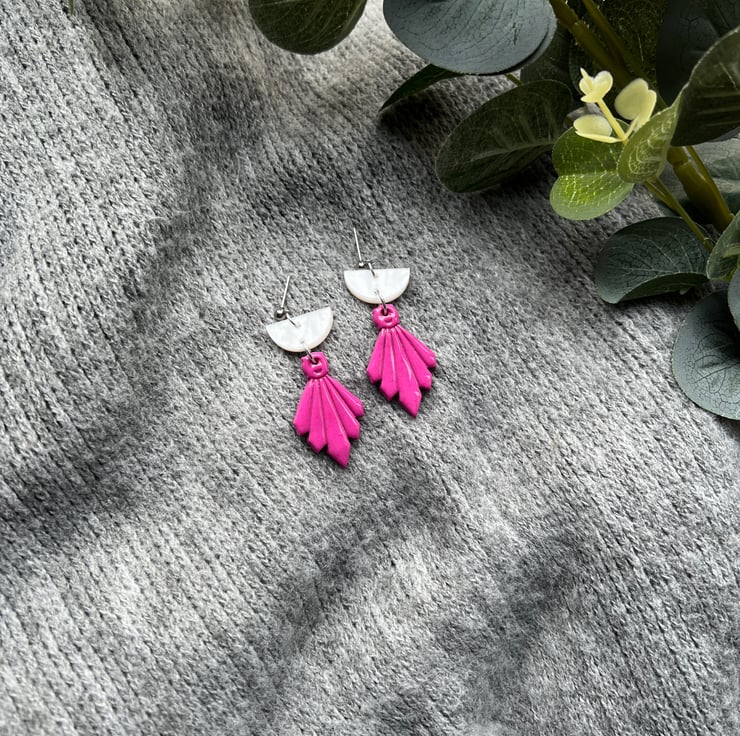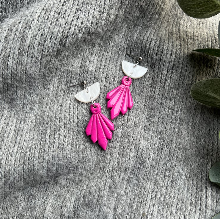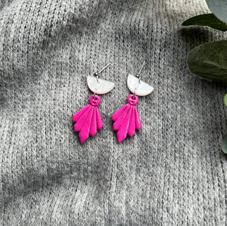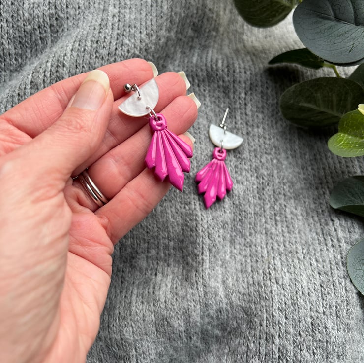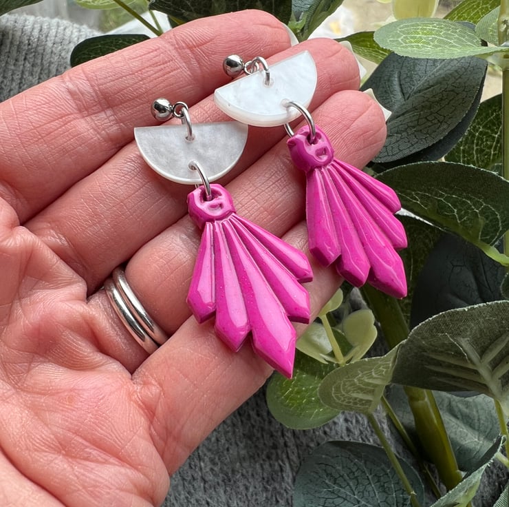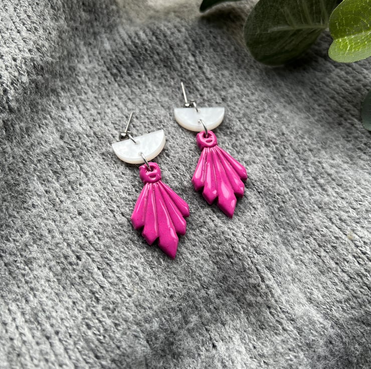 Attached to a Art Deco style shape in a deep fuchsia pink with glorious embossed lines and a very subtle shimmer, highlighted by a UV Resin finish
