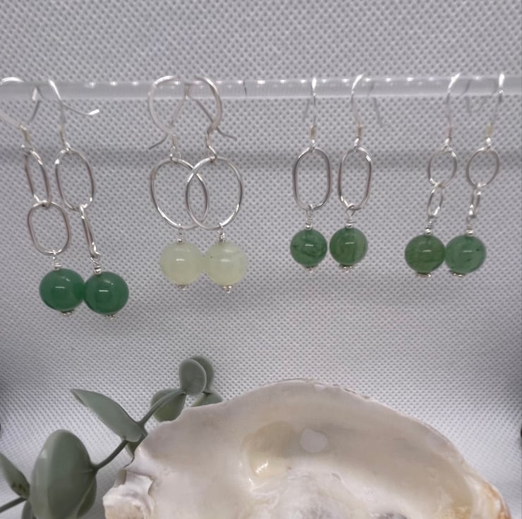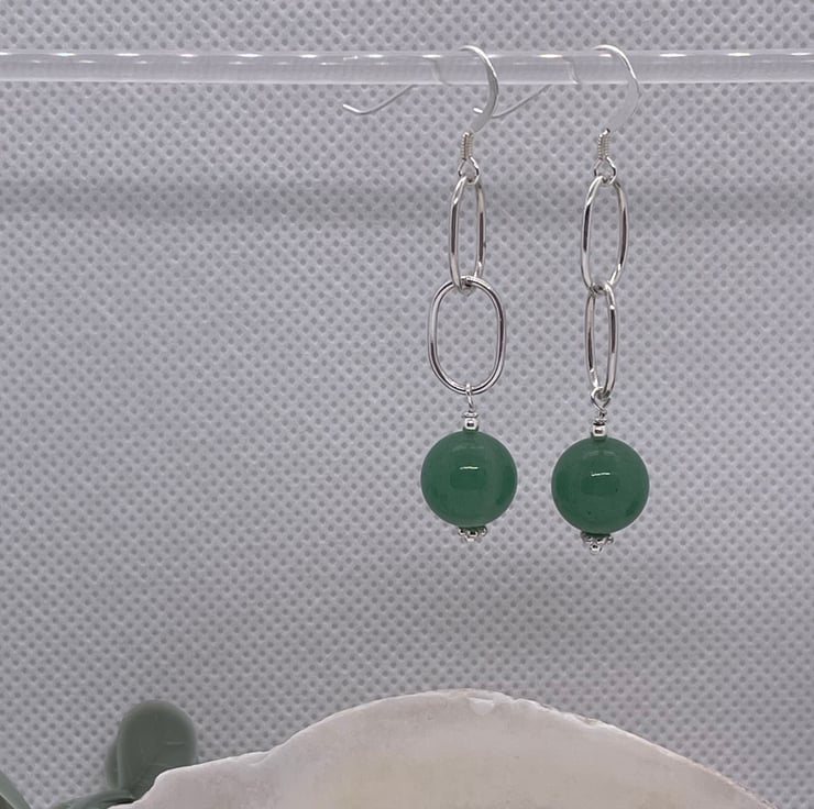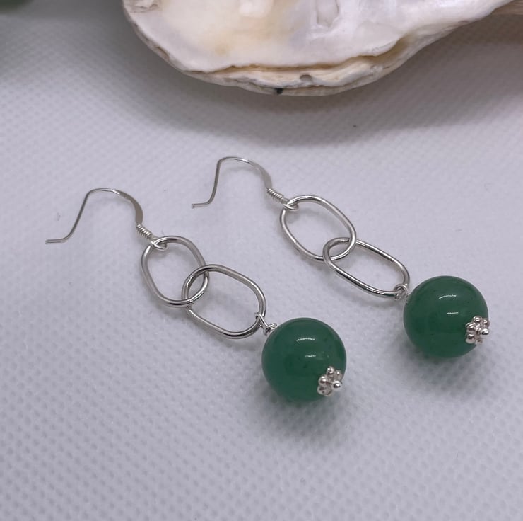 Pretty green round Aventurine beads hang from sterling silver wire oval links.