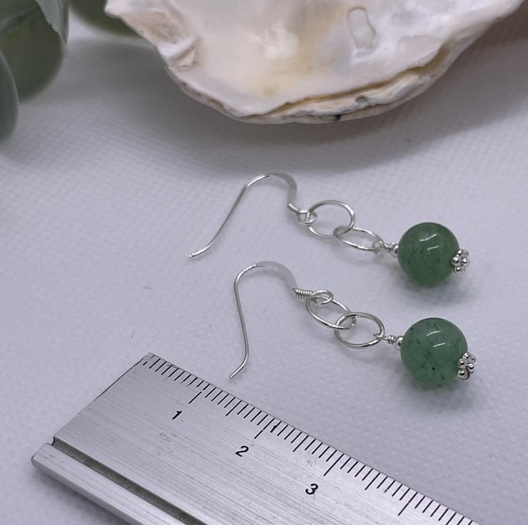 Pretty green round Aventurine beads hang from small sterling silver wire oval links.