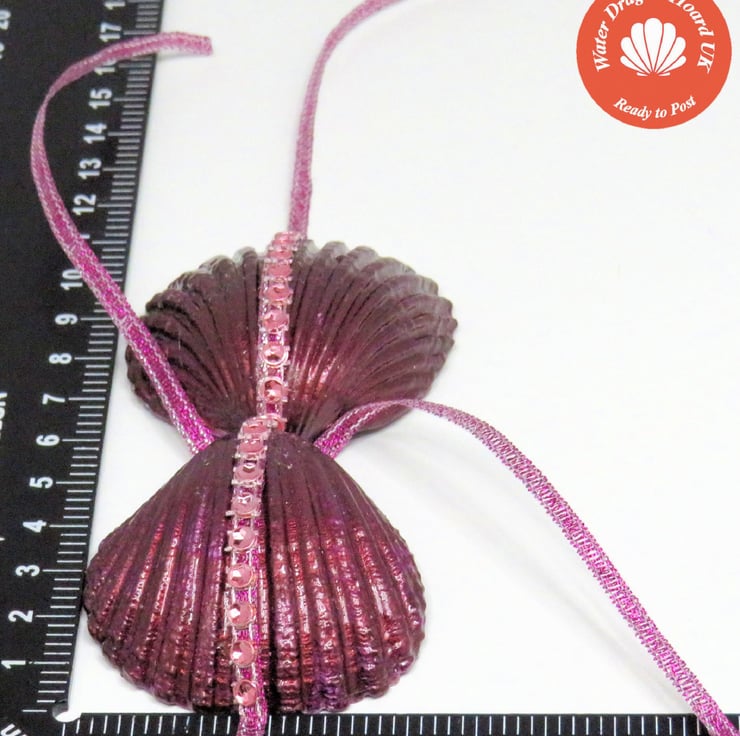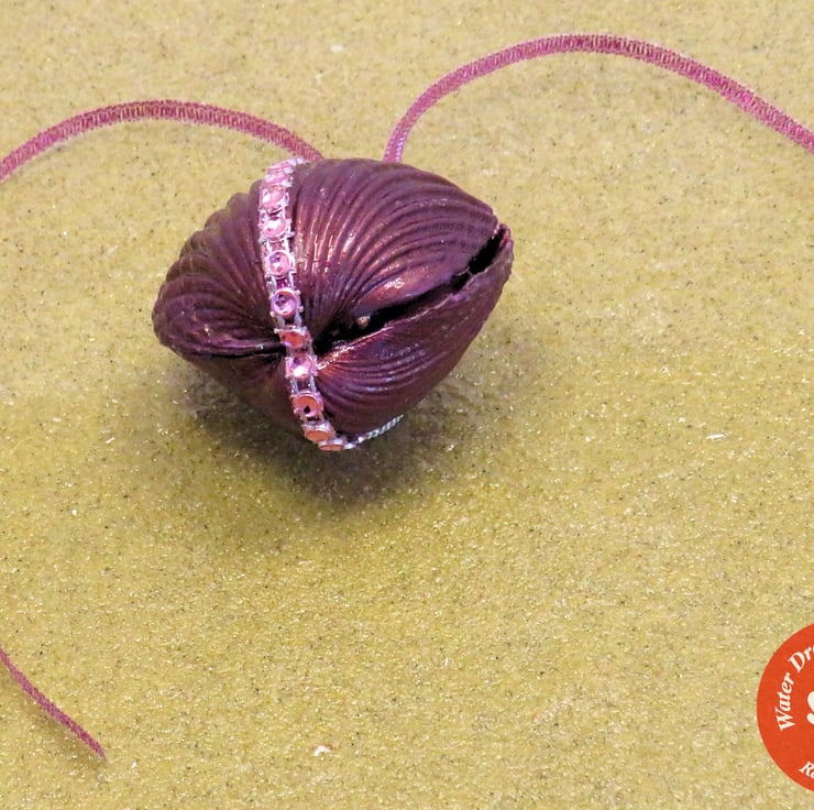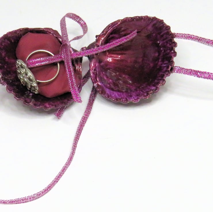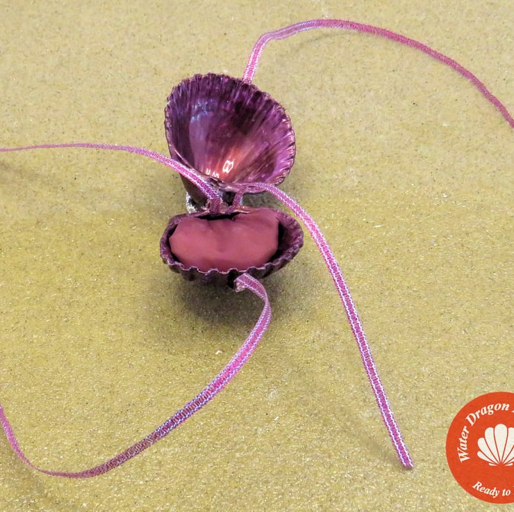This beautiful and elegant naturally hinged cockle shell can hold one ring comfortably and has been painted and adorned with ribbon ties to tie in the rings in the box to make sure all is as secure as you can make it.