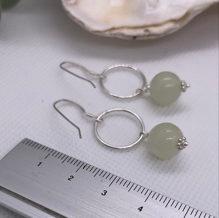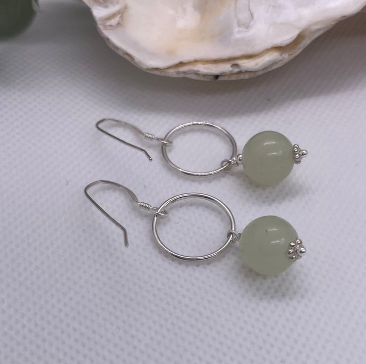 Pretty pastel green round Soochow Jade beads hang from sterling silver circles.