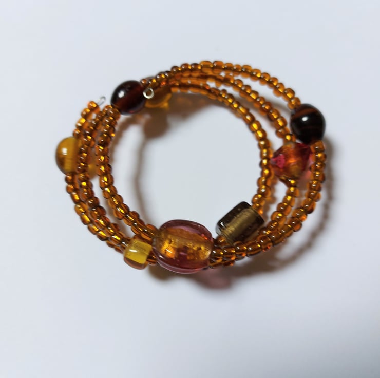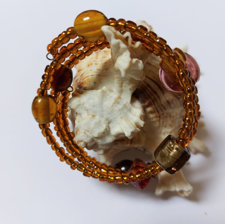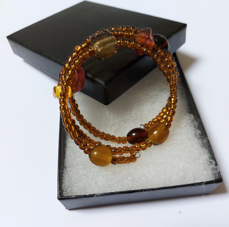 This bracelet makes me think of falling leaves and cosy fires. The glass beads include a background of 3mm seed beads and a number of larger beads - all in warm shades of amber and honey with a few darker brown items for contrast. The beads are threaded onto a spiral of steel memory wire, which returns to its original shape no matter how much you distort it. The bracelet sits comfortably on your wrist and is extremely easy to put on and remove. The ends of the wire have been twisted to form loops which hold the beads in place.