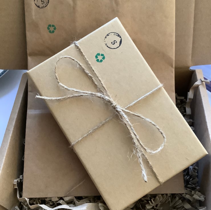 Delivered in brown gift box, gift bag made from recycled materials and comes with a short bio.
