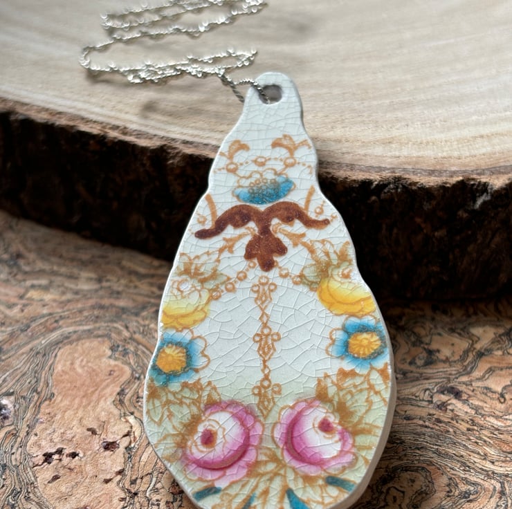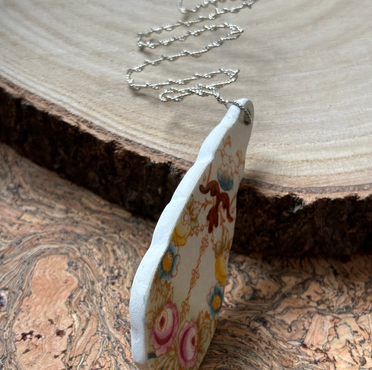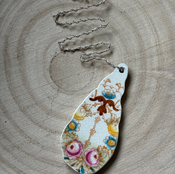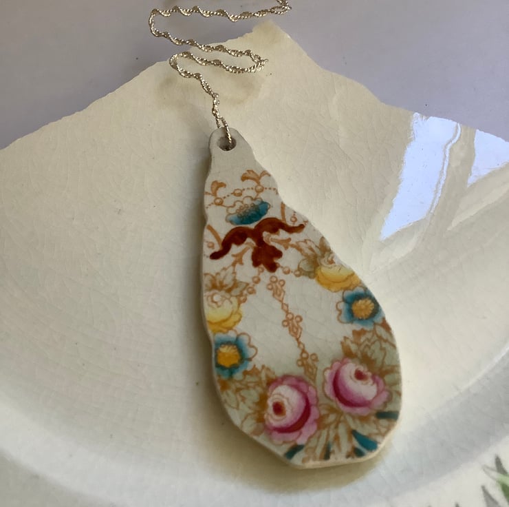 Hand crafted Jewellery and framed artworks using pre loved and discarded ceramics. Ceramic material will show signs of wear and damage. Entire process is a creative experience from discovery to final picture, nothing planned or preconceived. All materials personally collected from river banks, charity shops, roadside, woods, recycle centres, beaches, wherever dropped, dumped or donated ceramics are found, cleaned and shaped into new stories. Each piece comes with a short bio of where the ceramic came from, date found and re-created. Some shards collected are used as found, others are cut randomly which shape the final work. Every piece is individual, nothing replicated, however, due to repetitive patterns in ceramics there will be some similarity but only through the ceramic material not in the final piece.