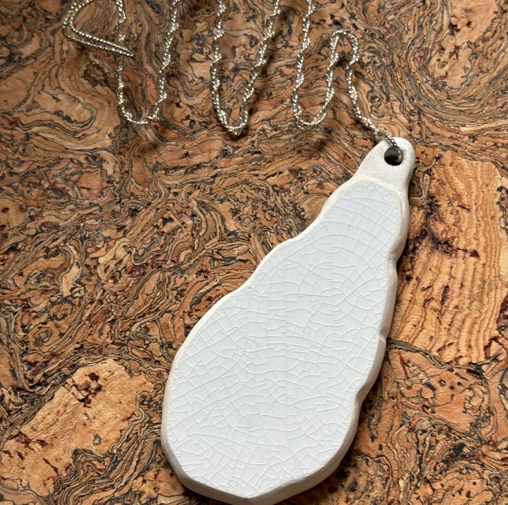 This hanging decoration is made from the largest shard, it broke almost in the shape it is now, all I did was snip off the sharp edges with a tile cutter, drilled a hole and sand the edges. Front, back glaze in tact and I’ve sanded around the hole on the back. Hanging on recycled textured wire which can be stretched longer or squeezed to shorten.