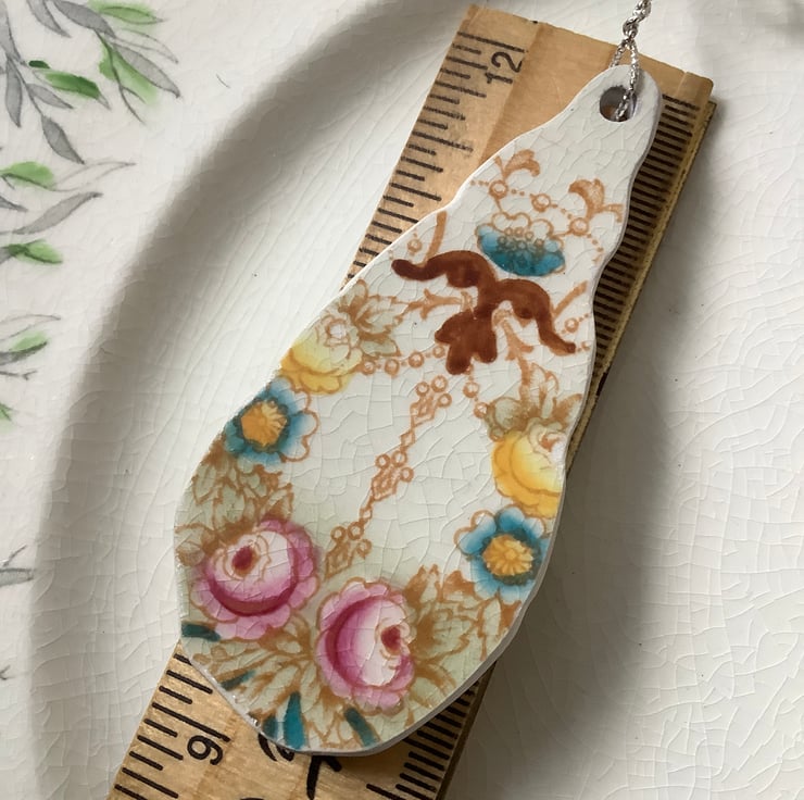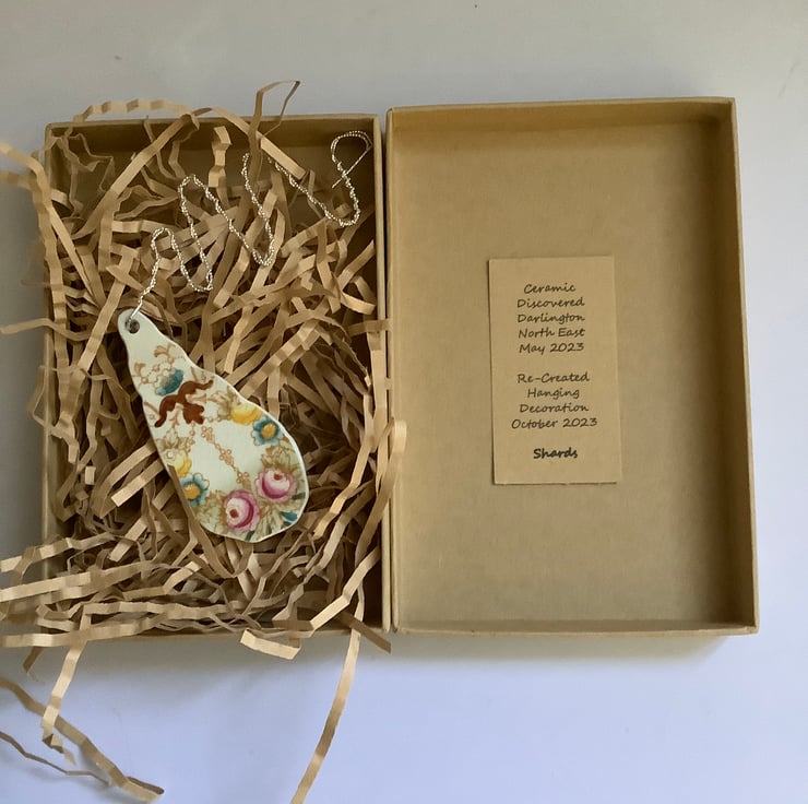The idea is to keep the character of the ceramic found, the finished piece is not meant to be highly polished or perfect. Found by chance in a box in Darlington destined to be recycled. Once a pretty wall plate, damaged and destined to be lost forever, now a hanging decoration, unique and full of history.