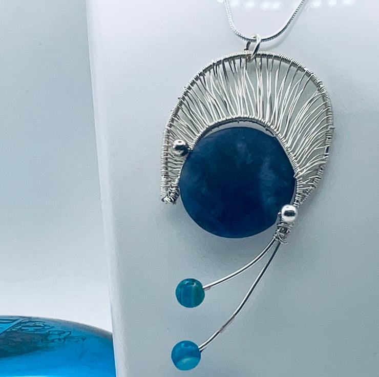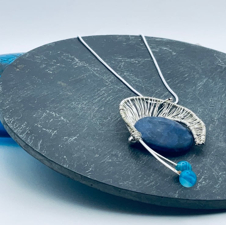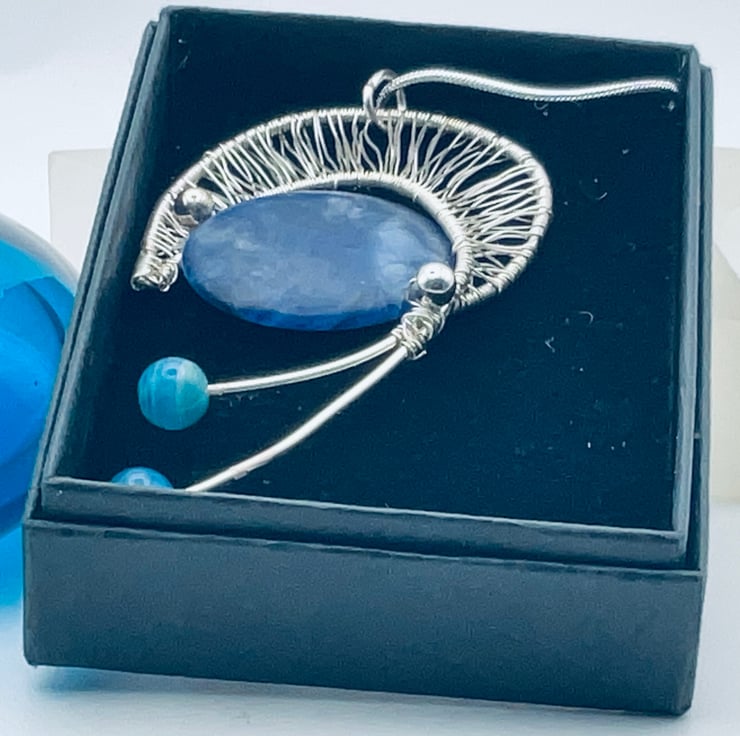 Ladder stitch is the use of silver wire to replicate a filigree sheet of wire.The blue sodalite has a matte finish to it rather than a gloss. This makes it hugely tactile! The tails are adorned with blue agate beads.