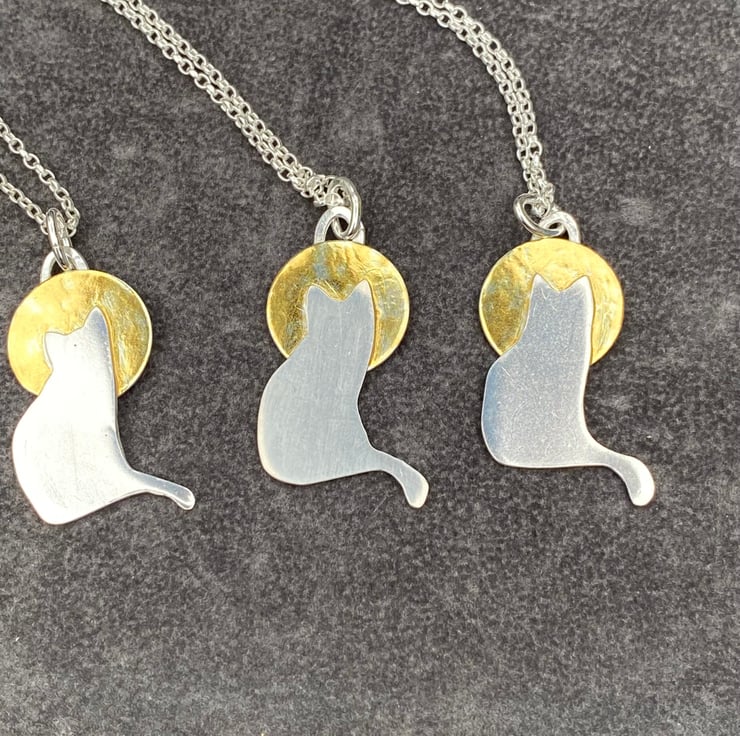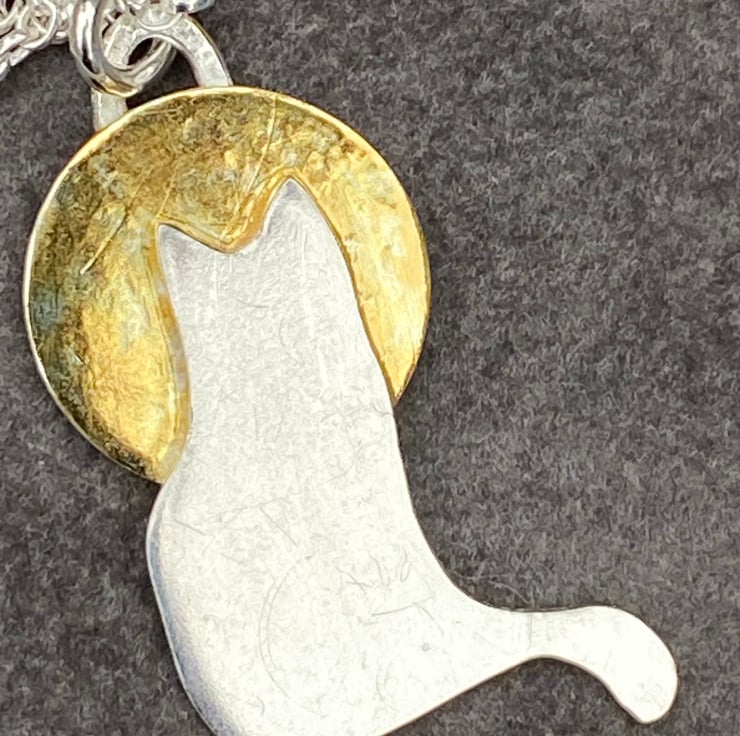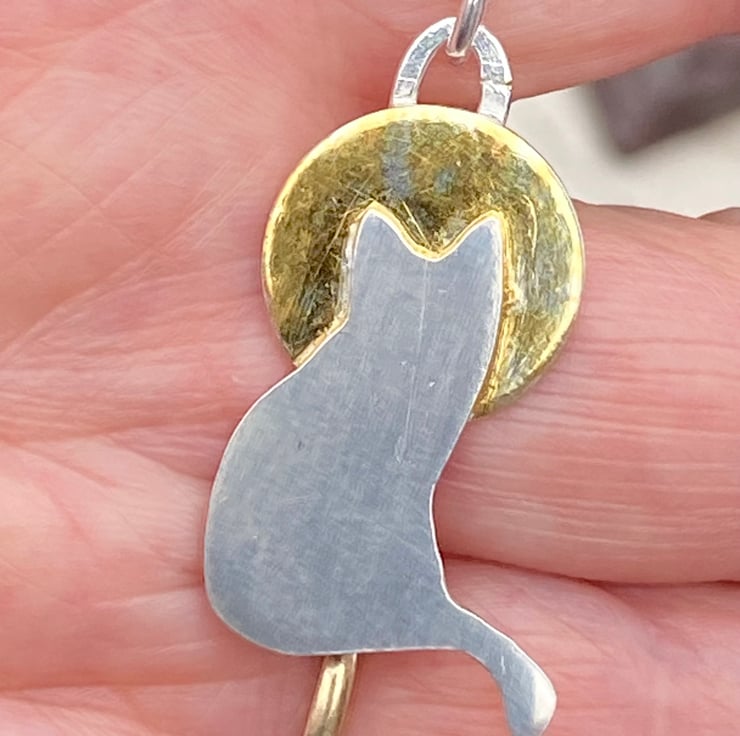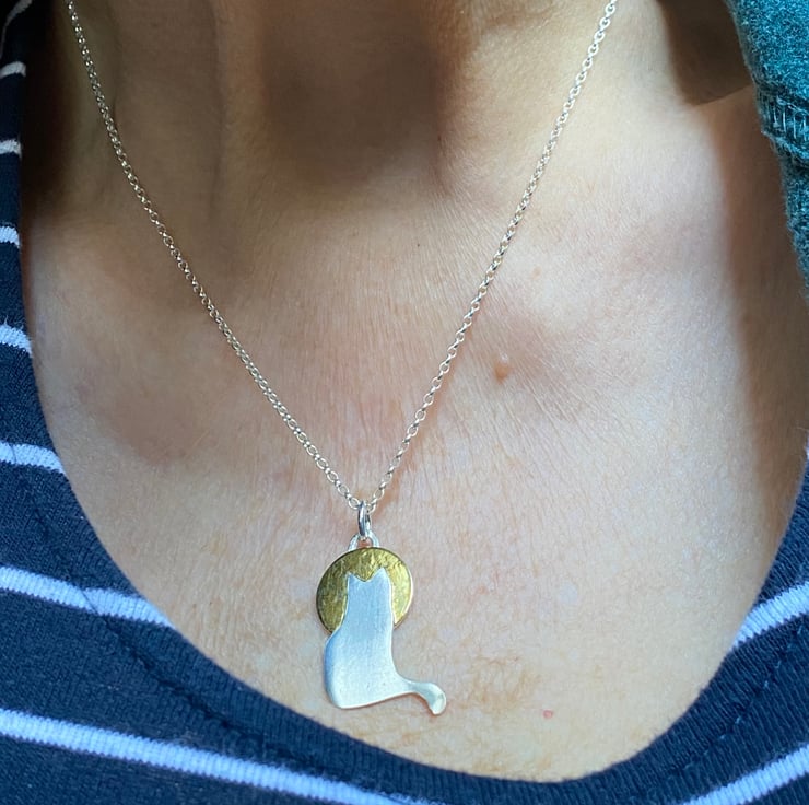 A purrfectly lovely fine silver feline sitting contemplating the rising Moon. The Moon is made of silver coated with 22ct carat gold. Because the pendant is made of fine silver it won’t tarnish over time. Comes with a Sterling silver 18inch chain.