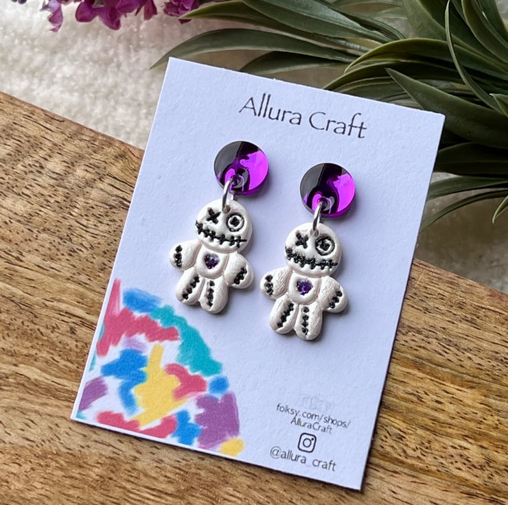 White polymer clay based, with pearlescent mica powder cut into a voodoo doll shape. With hand place black polymer clay pieces for the stitching detail.
